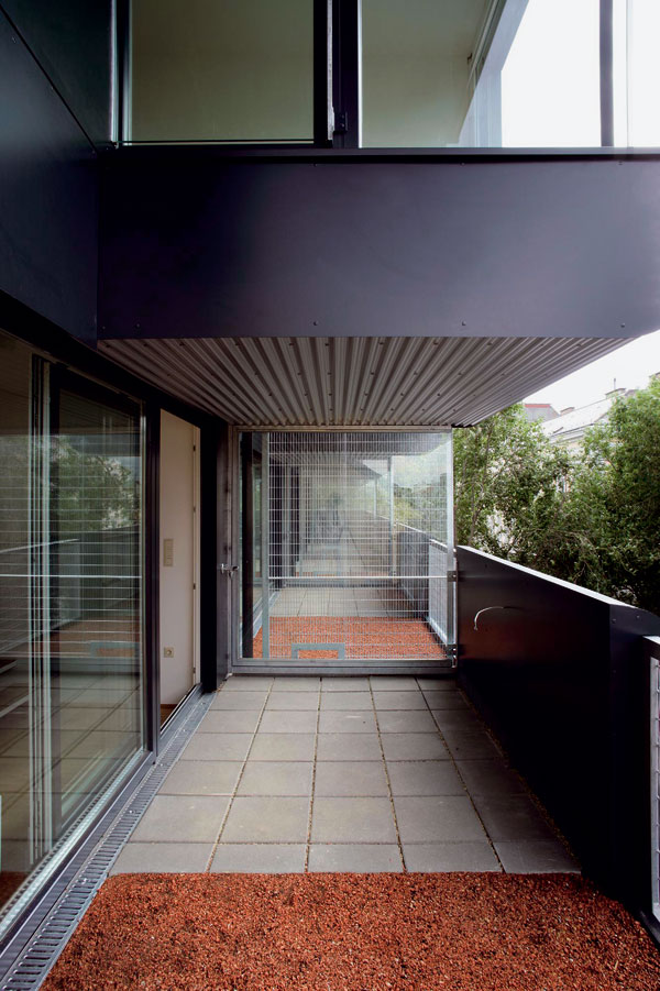 Najvýraznejším motívom domu je však dvojpodlažný charakter bytov so zelenými lodžiami. „Zelený záves“ na fasáde domu, oddeľujúci byt od rušnej ulice, je nielen prvkom poskytujúcim oddychovú zónu či prirodzené tienidlo počas horúcich dní, ale aj zreteľným výrazovým prostriedkom na dosiahnutie estetického účinku budovy. Zelená záhrada na lodžii je od obývačky oddelená luxusnejšie poňatými posuvnými dverami. „Pri vstupe do tohto malého súkromného zeleného priestoru si však človek uvedomuje, že to nie je luxus, ale nevyhnutná súčasť našej efektívnej práce s dispozíciou bytu, ktorého pôvodná cena sa znásobuje hodnotou dlhodobého používania,“ upozorňuje Markus Geiswinkler.