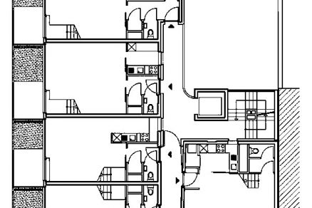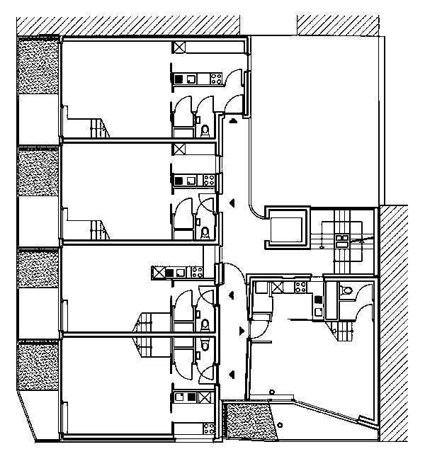 Výsledkom je dom so 17 bytmi, pričom každý z nich má vlastnú záhradu, tesne spojenú s obývačkou. Voľná dispozícia pôdorysu zase poskytovala veľkú rozmanitosť usporiadania bytov podľa potrieb a prianí užívateľov. Flexibilita bytov sa tak stala pridanou hodnotou, ktorá sa zhodnocuje v ich prevádzke. Všetky byty prechádzajú cez celú budovu, čiže siahajú od dvora až po ulicu. Dôsledná hĺbka krídiel bytov vytvára množstvo dlhých a úzkych priestorov, ktoré majú jasnú prevádzku.
