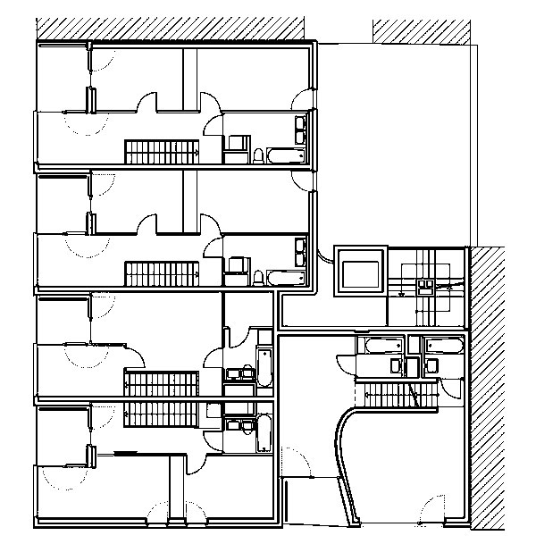 Rozdelenie obytných priestorov na dvoch úrovniach vytvára puzzle, ktoré do seba zapadá vo vertikálne poskladaných celkoch. Niektoré byty majú viac priestoru na nižšej úrovni, iné zase na hornom poschodí. Dôvtipné skladanie tvarov na vyššom poschodí znamená, že jednu strana lodžie tvorí arkierové okno, zatiaľ čo druhá strana je nad priestorom zelenej záhrady.