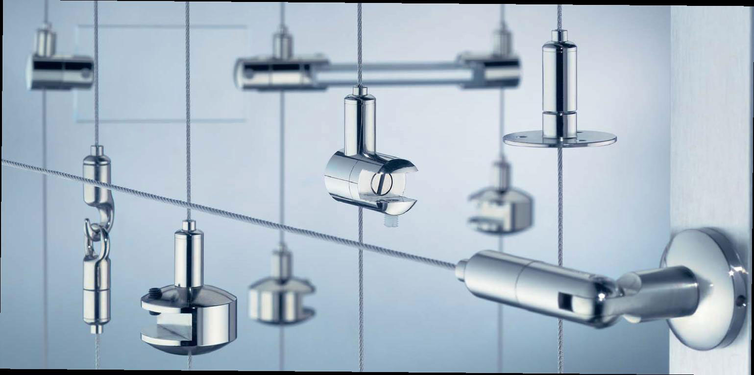 Závesný systém kombinuje základné prvky voľného antikorového lana, lanové napínače a príchytky s rôznymi doplnkovými prvkami na vytvorenie inovatívnych riešení v domácnosti, predajni, galérii či firme.