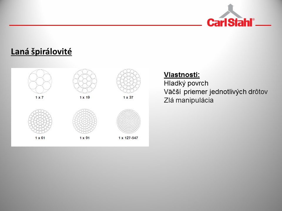 – v štandardnom priemere pri konštrukcii 6 × 7 máme laná s Ø 1 – 8mm; pri 1 × 19 laná v Ø až 26 mm