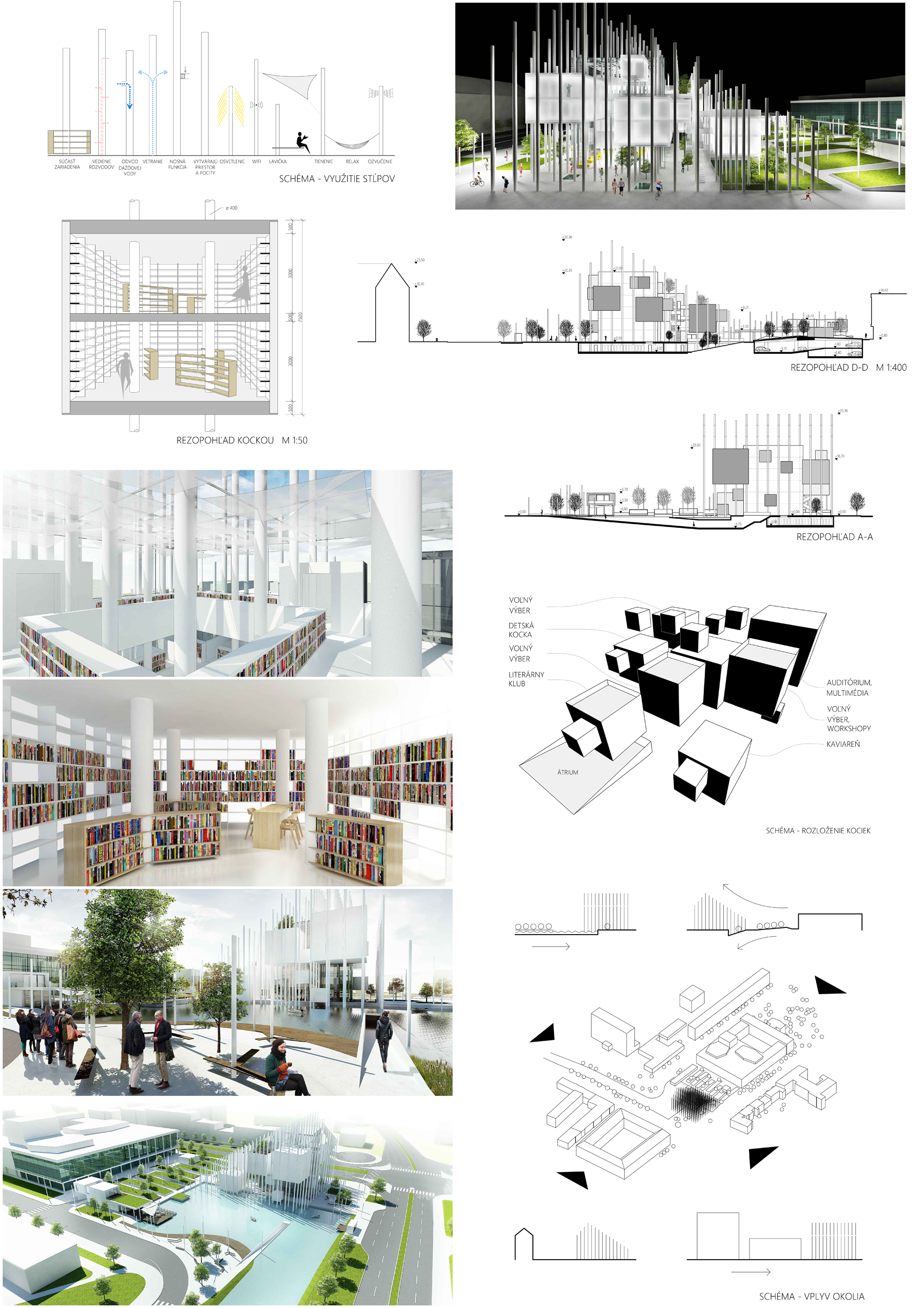 Autorke sa podarilo implantovať kultúrnu „plombu“ do postindustriálneho prostredia Ulice 29. augusta. Vhodnou kombináciou doplnkových (obslužných) funkcií vniesla do dnes smutného mestského bloku „klokotajúci“ a nikdy nekončiaci život. Horizontálnym vrstvením hmôt, ich umným prerušovaním komunikáciami v horizontálnom i vertikálnom smere a vhodným uberaním hmôt umožňuje prienik prirodzeného svetla aj do posledného kúta – mestskej „jamy“. Elaborát preukázal odbornú zdatnosť a pripravenosť autorky prijať akúkoľvek výzvu.