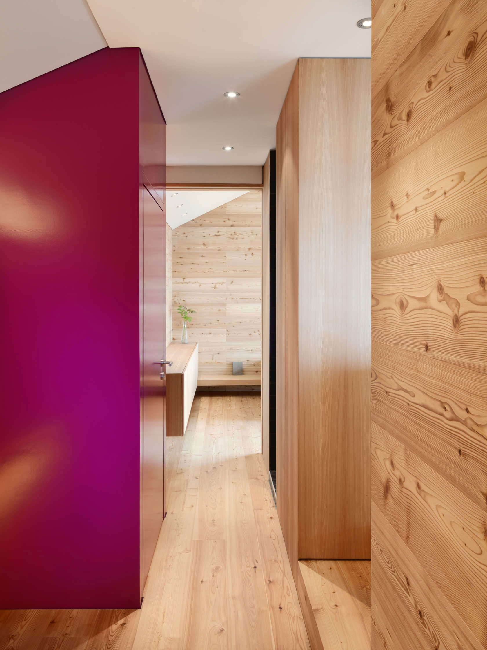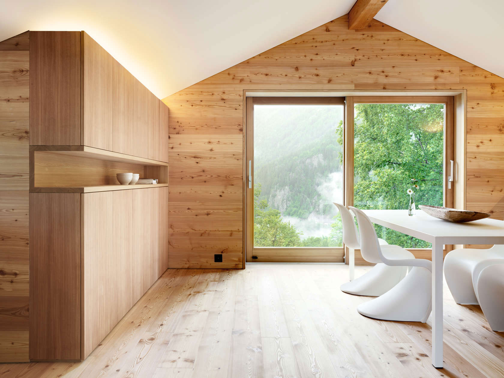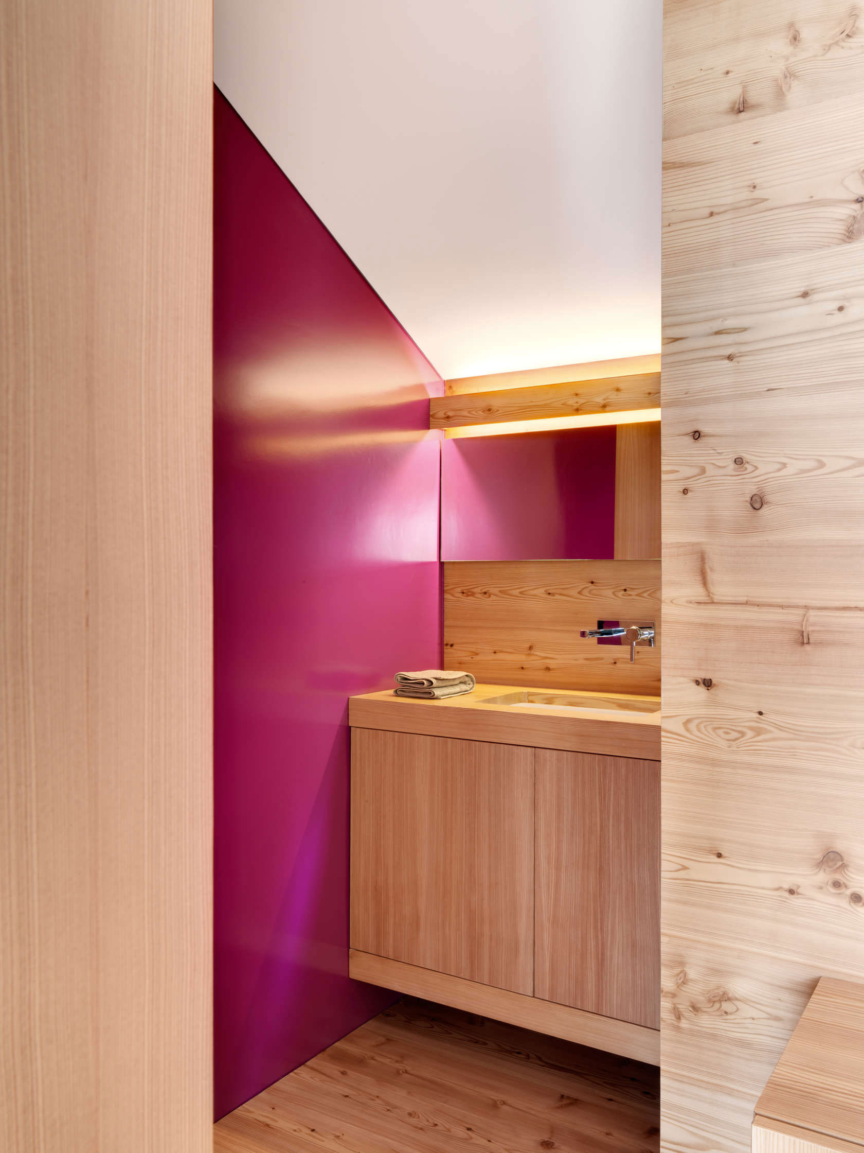 Interiér dýcha prívetivosťou a pohostinnosťou. Teplé drevené tóny mu dodávajú relaxačný charakter a lákajú vás dovolenkovať v ktoromkoľvek ročnom období. V lete lokalita ponúka nádherné výhľady na okolité prostredie a zeleň, v zime zase kvalitné útočisko pre chvíle strávené v kruhu rodiny či priateľov – napríklad pri kozube. Aby interiér nepôsobil nudne a príliš jednoliato, architekti zvolili biele stropy a niektoré kusy nábytku sú tiež v snehobielom odtieni. Výrazná purpurová stena v kúpeľni, farebné textilné doplnky a živé rastliny tvoria malé, ale nevyhnutné detaily, ktoré oživujú celý priestor. Chalet DAL je stelesnením pohodlia. Dom je ideálny pre človeka, ktorý ma rád typickú horskú chalúpku, kde vládne drevo, no zároveň pôsobí moderne a útulne.