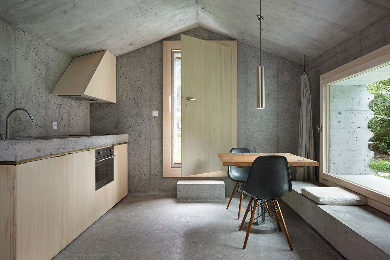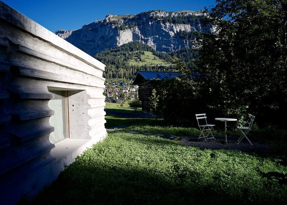 Z diaľky vyzerá ako tradičná drevená chalúpka, zblízka však zistíte, že je to celkom inak zrealizovaná stavba. Celobetónovú chalúpku, ktorá zároveň šokuje aj ohromuje, navrhli dvaja šikovní architekti – Georg Nickisch a Selina Walder – podľa modelu starých chatrčí stojacich v danej lokalite. Od pôvodnej drevenej chatky si nová stavba neprevzala iba pozemok, na ktorom stojí, ale aj pôvodnú konštrukciu a svoj vonkajší vzhľad. Drevo autori nahradili betónom, vďaka čomu stavba pôsobí veľmi netradične, pre niekoho možno až extrémne.
