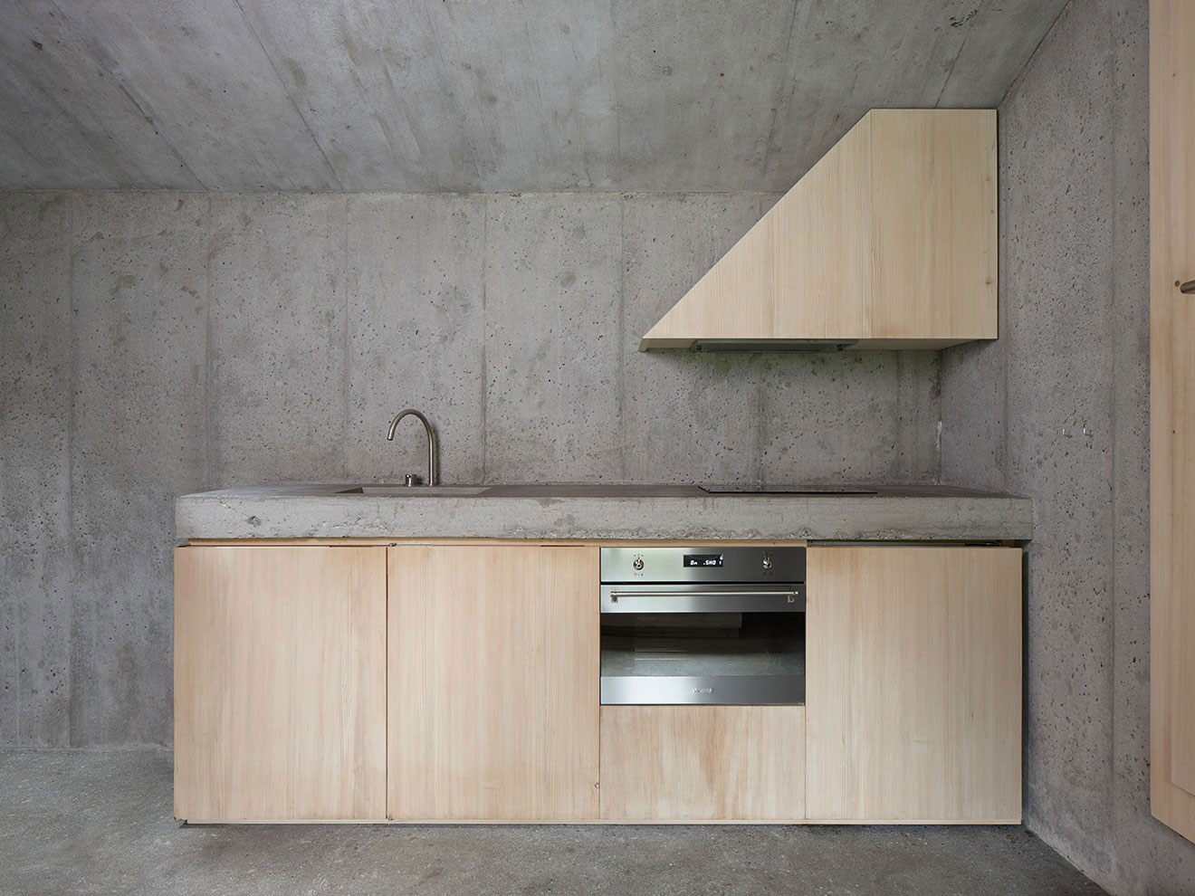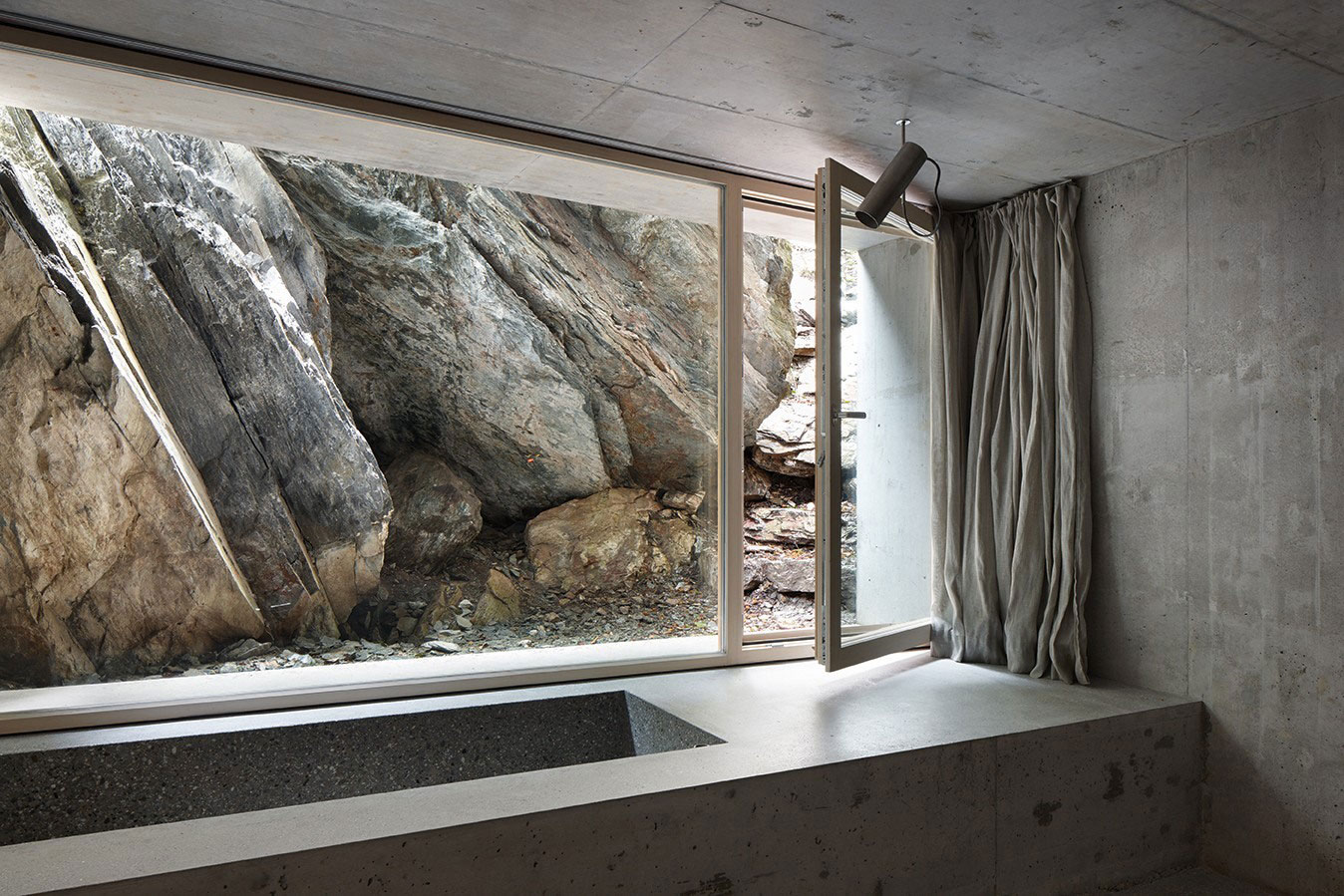 Dom pôsobiaci dojmom fosílie pôvodnej drevenej stavby, ktorá stála na jeho mieste predtým, je komponovaný z betónových blokov – architekti nimi obložili konštrukciu pôvodnej stavby. Betón je dominantným materiálom celého zovňajšku aj interiéru. Hrubé steny dopĺňajú dobre zaizolované okná a svetlík, vďaka čomu je priestor presvetlený prirodzeným svetlom. Jeho dispozícia je veľmi jednoduchá. Z vchodových dverí vojdete priamo do spoločenského priestoru tvoreného spojenou kuchyňou a obývačkou. Okrem toho sa v stavbe nachádza už iba jedna miestnosť – spálňa spojená s kúpeľňou. Zvláštnosťou je, že spálňa sa nenachádza na nadzemnom podlaží, ako by sa mohlo zdať, ale práve naopak – je čiastočne vnorená do zeme a zasklenou plochou otvorená smerom k obrovskej skale, ktorá výhľadu dodáva jedinečný ráz. Dom je teda prízemný, dalo by sa povedať, že spálňa je dokonca v podzemí.