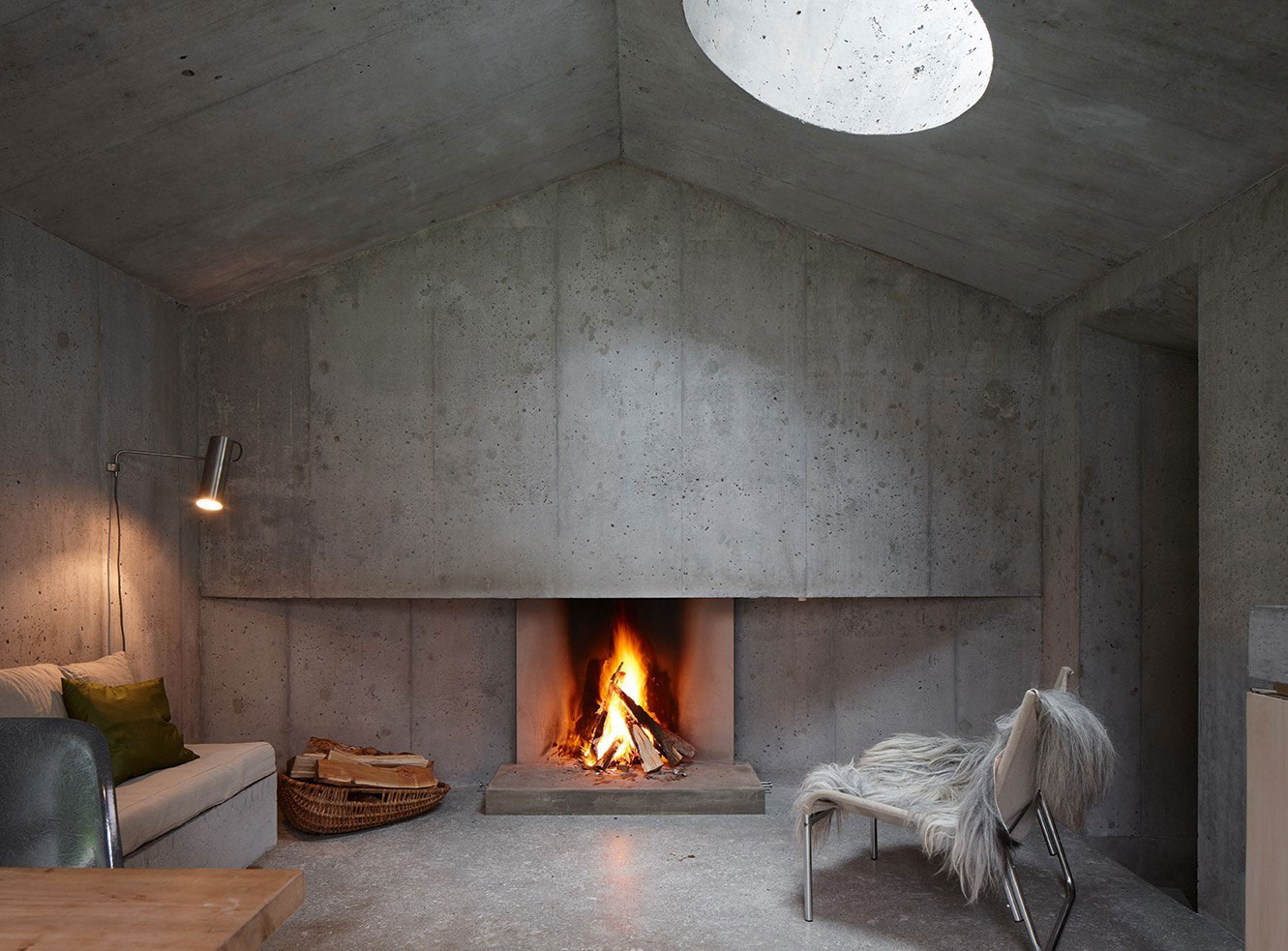 Napriek tomu, že dom pôsobí chladným dojmom, architekti sa postarali o to, aby v ňom bolo príjemne teplo. Lavica, ktorá začína pri kozube a tiahne sa popod okno v obývacej časti, je (rovnako ako betónová vaňa v spálni) vyhrievaná. Kozub efektívne vyhreje celý interiér a kožušiny sú už iba príjemným vizuálnym doplnkom, keďže opticky zjemňujú strohý priestor. Rovnakú úlohu plní aj drevený jedálenský stôl či kuchyňa.