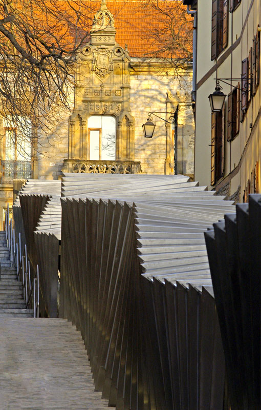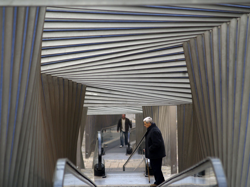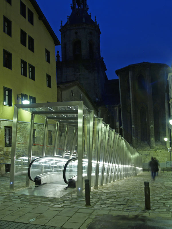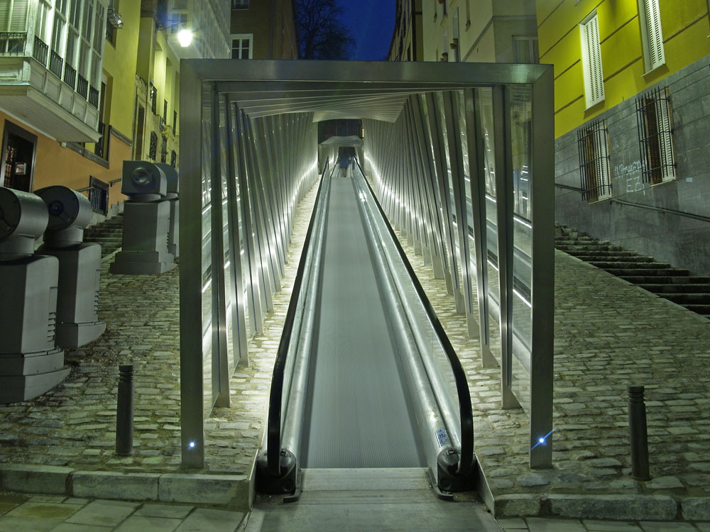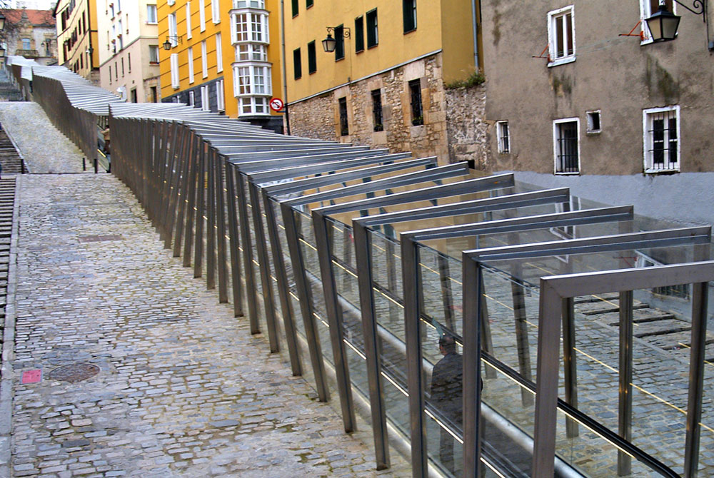 Strmý kopec v historickom centre rozdeľuje mesto na polovice. Architekt Roberto Ercilla dostal úlohu uľahčiť prepojenie týchto 2 častí a zároveň umožniť handicapovaným obyvateľom prístup ku kultúrnemu centru na kopci. Po oboch stranách kopca vytvoril travelátory, aké stretnete v supermarketoch. Tu ich však nájdete priamo uprostred historických ulíc. Keďže sú vo Vitorii počas roka náročné poveternostné podmienky, uzavrel Roberto Ercilla rampy do tunelov z nehrdzavejúcej ocele a skla. Ich rozdelenie na kratšie úseky umožňuje prirodzený pohyb naprieč osou travelátorov. Zostane vám však pocit plynulosti. . Realizácia vyšla približne na 3,5 milióna eur.