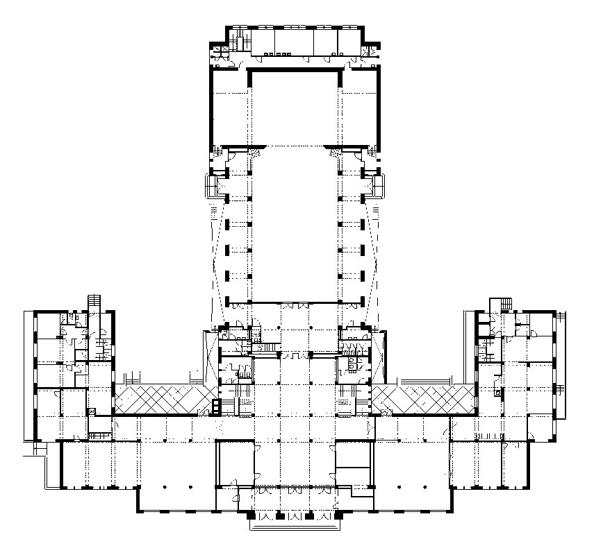 Prísnosť symetrie stavby je zrejmá aj v dispozícii jednotlivých podlaží. Centrálna vstupná hala so symetrickými schodiskami je riešená cez dve podlažia. Z galérie možno vnímať jej monumentalitu a nadčasový dizajn jej interiéru.