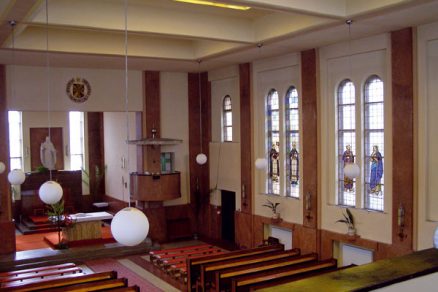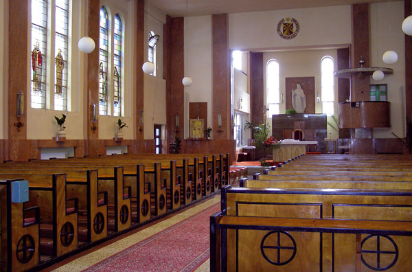 Hnedočervený materiál podlahy prechádza aj do sokla, lizén, stĺpov a kazateľnice, ktorých omietky sú imitáciou mramoru. Súčasťou kostola je takmer v plnom rozsahu zachovaný dobový mobiliár s kvalitným dizajnom: drevené lavice, organ, polychrómované lampy či pochrómované mreže radiátorov. Plochý strop hlavnej lode kostola priečne rozčleňujú železobetónové nosné trámy, ktoré sú priestorovo previazané s plastickými lizénami bočných stien, vytvárajúc tak rytmicky členený priestor interiéru. Vnútorné členenie (strop je v každom konštrukčnom poli obohatený obdobnými svetlíkmi ako v svätyni) sa formou lizén prenáša ako priestorové kompozičné travé do exteriéru. Okná majú plastický lem, ktorý spolu so soklom, lizénami a korunnou rímsou vytvárajú jednoduché členenie exteriérovej fasády.