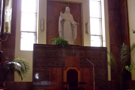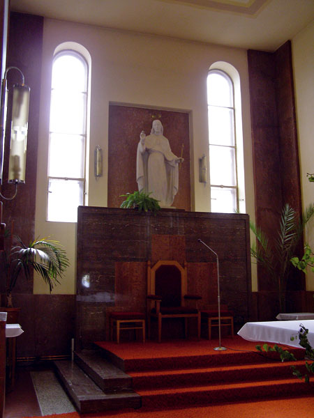 Svätyňa je presvetlená zo severnej strany cez východné krídlo objektu Moyzesova 8 v časti galérie a oratória. Medzi oratórium a svätyňu je vložená kovová zasklená priečka. Na východnej strane je presvetlená dvojicou okien s polkruhovým ukončením, ktorých pôvodné vitráže nahradili jednoduché sklenené výplne. Svätyňu presvetľuje aj štukovým lemom orámovaný obdĺžnikový svetlík osadený do rovného stropu s výplňou v kombinácii drevo, kov a sklo. Sklo je vo dvoch tónoch žltej farebnosti. Medzi východné okná svätyne je osadený pevný oltár s podstavcom, menzou, predelou a nadstavcom z červeného mramoru. Pred nadstavcom je centrálne umiestnená mramorová socha Krista Kráľa. Nad otvorom medzi svätyňou a hlavnou loďou ukončeným rovným prekladom je v omietke vytvorený znak rádu lemovaný nápisom: LAUDARE, BENEDICERE, PRAEDICARE.