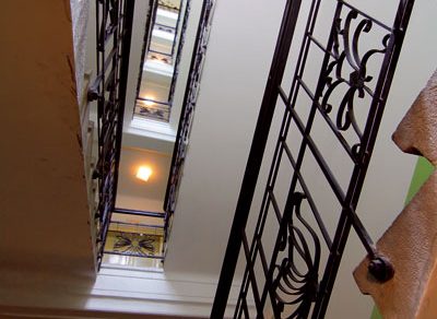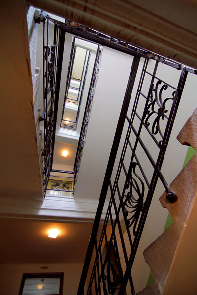 Pozoruhodné je však aj samotné dispozičné riešenie. Na poschodí sú tri byty – stredný trojizbový a krajné štvorizbové. Kúrenie bolo etážové a dodnes je funkčné. Na bývanie bol neskôr upravený aj čiastočne zapustený suterén. K zaujímavým zážitkom v dome patrilo pre mňa aj stretnutie s 87-ročným pánom Zervanom, ktorý tu býva vyše 53 rokov a je žijúcou kronikou histórie tohto mimoriadneho architektonického diela. Nepríjemným prekvapením však bolo zistenie, že tento pozoruhodný objekt nie je zapísaný v zozname kultúrnych pamiatok. Som presvedčený, že tam patrí.