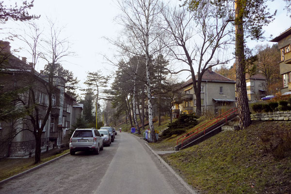Prístupová cesta prekonáva výškový rozdiel v dvoch oblúkoch, ktoré zároveň ohraničujú zónu zo západnej strany a privádzajú postupne na dve rovnobežné ulice nad sebou. Tie kopírujú vrstevnicu – z nich je prístup k jednotlivým domom. Okrem najvrchnejšieho radu je teda vždy komunikácia na severnej strane. Tieto lineárne cesty na vrstevnici tvoria organizujúci prvok štvrte – vytvárajú zónu stretávania sa obyvateľov. V súčasnosti je však ulica, ktorá bola kedysi korzom, zaplnená autami. V budúcnosti bude určite možné uspokojivo vyriešiť parkovanie s citlivým prístupom a s využitím terénu.