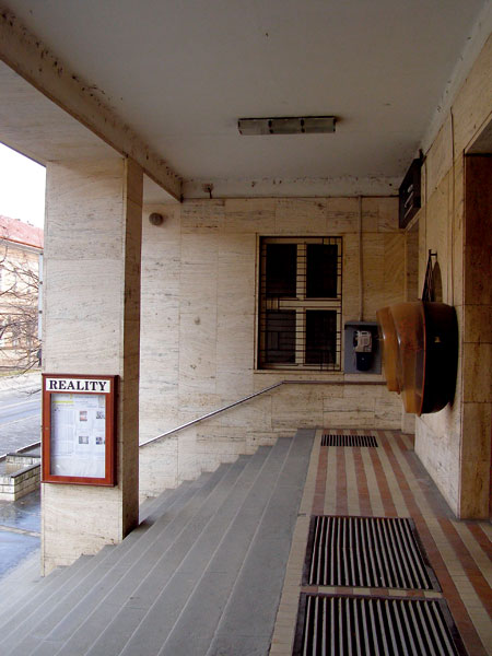 Túto čistú kompozíciu dopĺňajú svetlé plochy omietky, podobne ako veľké okná radené na fasádach prevažne do horizontálnych pásov či štýlové kruhové okná na vstupnom priečelí hlavnej budovy. Hlavný vstup pre verejnosť z Poštovej ulice je umiestnený centrálne v telese dlhého trojpodlažného objektu. Dominuje mu monumentálne schodisko riešené po celej šírke vstupu. Obložené je travertínom, tak ako aj dva piliere deliace opticky vstupný priestor na tri časti.