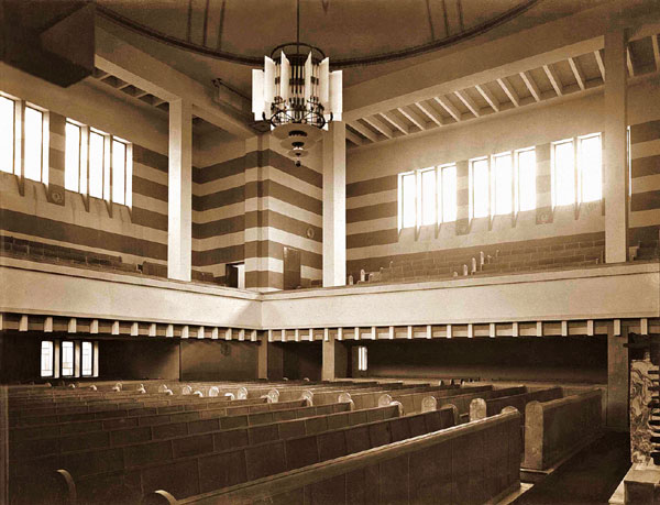 Členením hmôt, usporiadaním priestorov a využitím terénu dosiahol pozoruhodný priestorový účinok stavby. Široké nástupné schodisko na terasu pred vstupom a nízke krídlo malej modlitebne mu pomohli zapojiť synagógu do okolitého mestského prostredia. Centrálny priestor modlitebne je zakrytý železobetónovou kopulou s priemerom 16 m, na ktorej je medený plech. Kopula je korunou stavby a pripomína orientálny pôvod náboženstva.