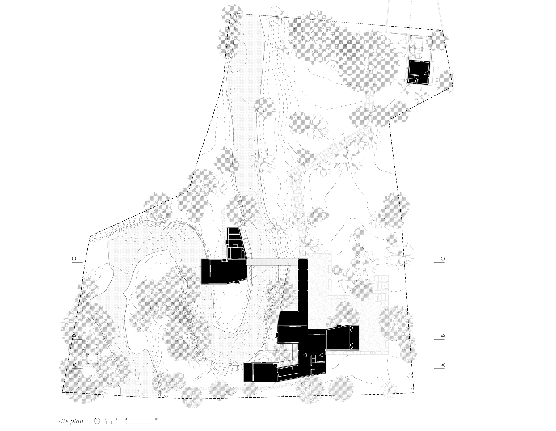 Obývacia izba je vyzdvihnutá nad pozemok vďaka čomu majú majitelia panoramatický výhľad na vzdialené hrebene hôr. Hosťovská izba sa vinie okolo existujúceho stromu, čím vytvára súkromný dvor a zároveň poskytuje výhľad na koryto riečky. Tvar bazéna nasleduje krivky koryta riečky a počas sucha je akousi jej pripomienkou.