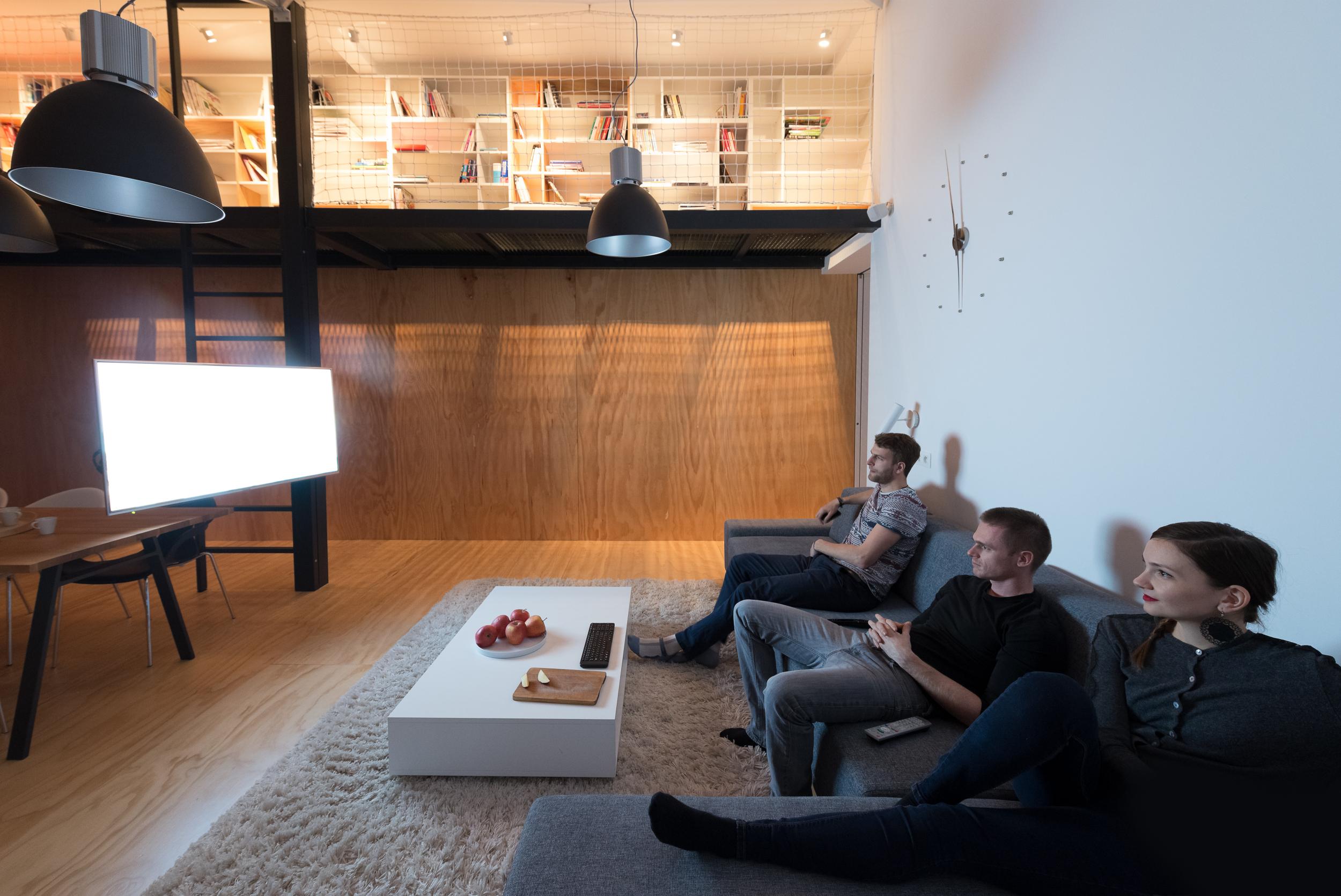 Pohodlná sedačka je otočená smerom k plochej obrazovke, ktorá je upevnená na špeciálnom nosiči. Kovová otočná konzola je vyrobená na mieru a umožňuje obyvateľom sledovať televíziu nielen z obývačky, ale aj z kuchyne – vďaka rôznemu sklonu ju dokonca možno využiť aj na pracovné účely, keďže sídli poblíž masívneho jedálenského stola. Skrytá kabeláž v konzole či komponenty ozvučenia ukryté v sedačke a kuchynskej linke výrazne odľahčujú priestor a nechávajú vyniknúť čisté línie a farebnú schému dennej časti loftu.