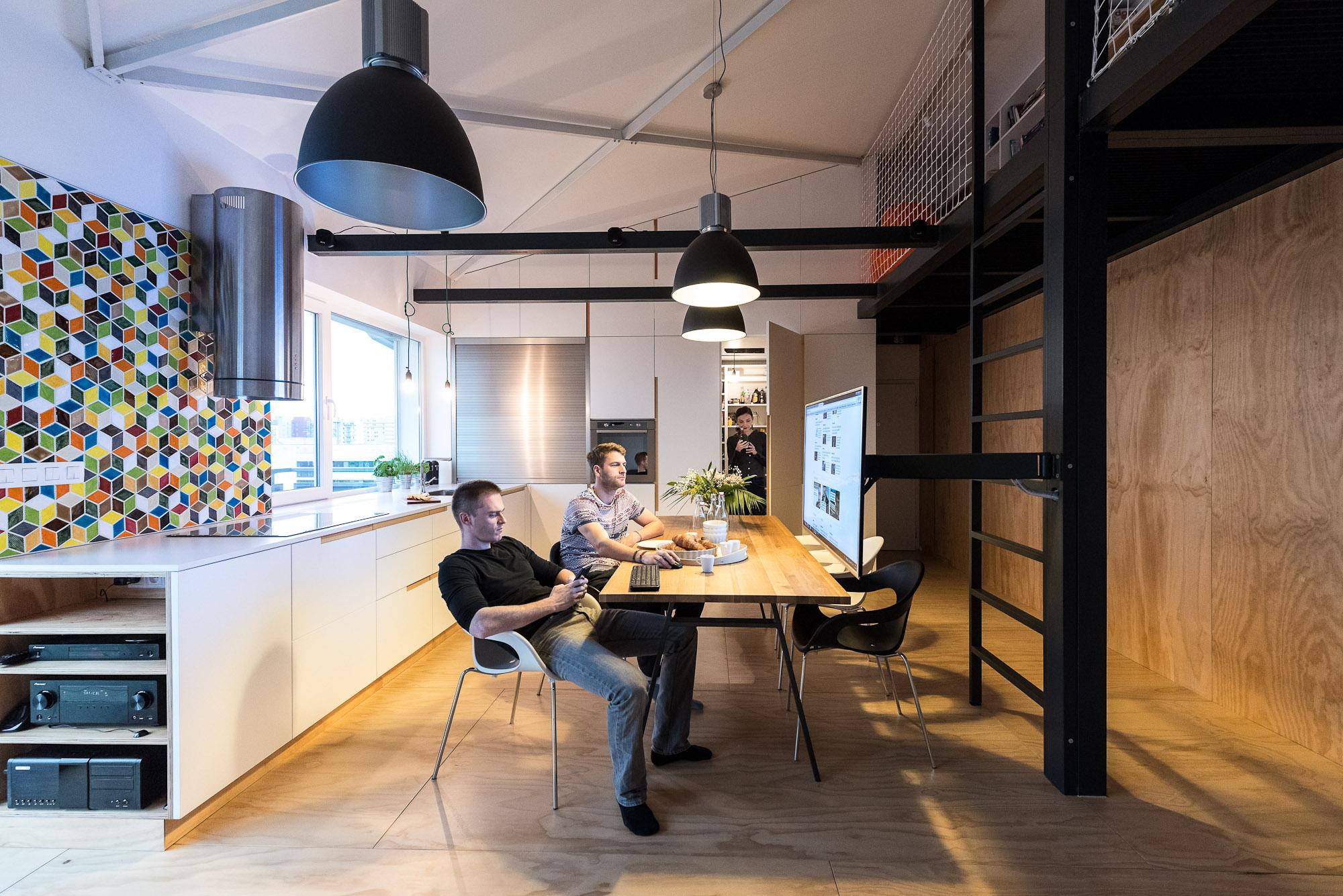 Industriálny nádych loftu dokonale zjemňujú jednotlivé interiérové solitéry – sivá sedačka, bledý koberec, drevené komponenty v kontraste s čiernym kovom, minimalistická biela kuchynská linka a v neposlednom rade originálna, ručne robená mozaika Sometile, ktorá svojou pestrosťou priláka pohľad každého návštevníka. Jednoduchá lepená podlaha z 15 mm hrubej borovicovej preglejky je odolná a zjednocuje celý priestor.