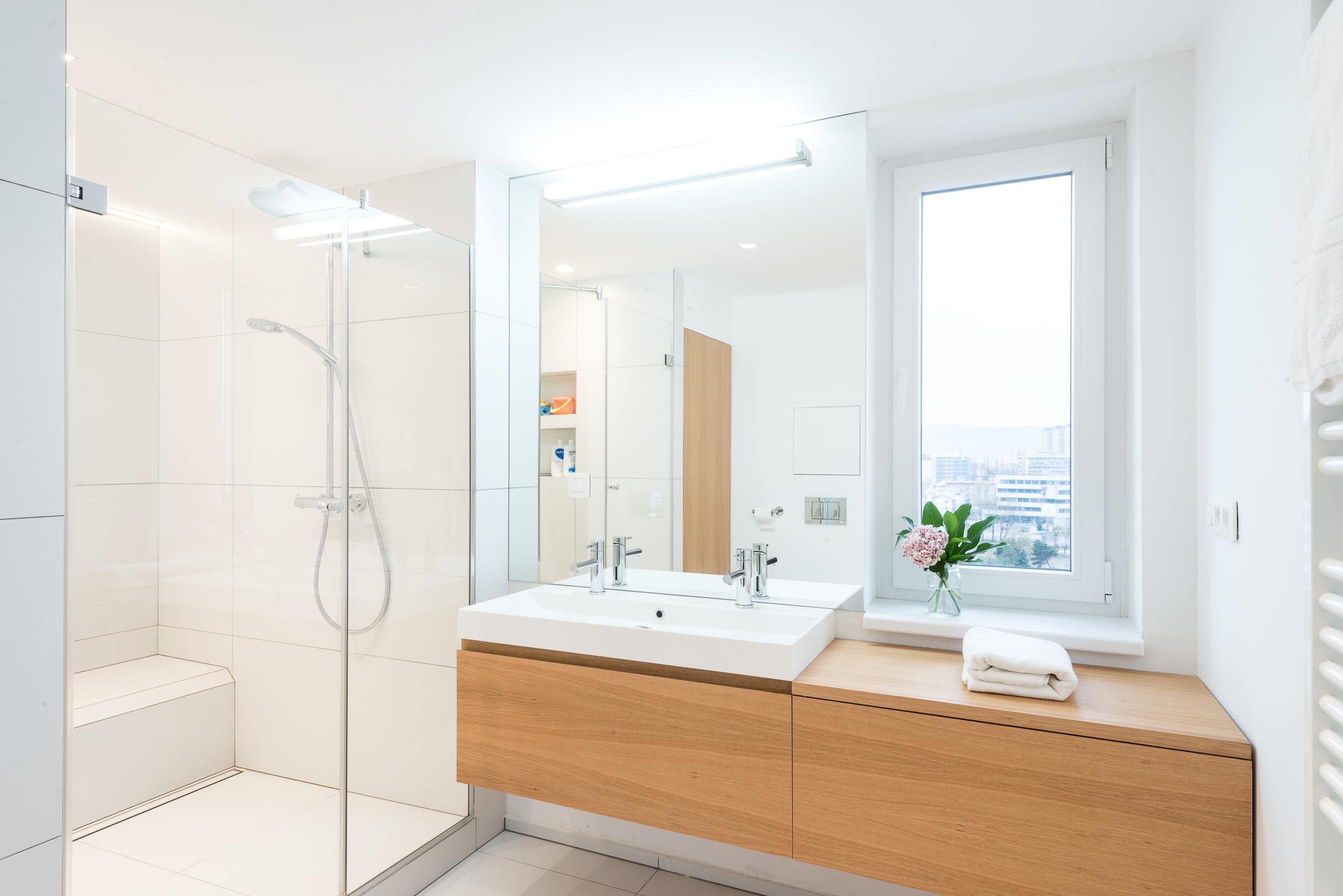 Rozmerná kúpeľňa ponúka veľký komfortný sprchový kút s praktickým schodíkom, na ktorý sa ešte zmestí detská vanička.