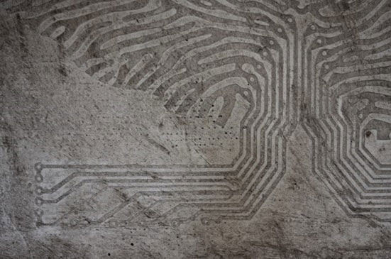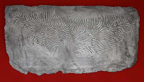 Prepojené dva motívy – 10 000 x zväčšený rez mozgom a motív integrovaného obvodu. Tým, že je to zhotovené ako odtlačok, ako „vykopávka“, sa dielo dostáva do polohy archetypu – akási minulosť, ktorá nás len čaká.