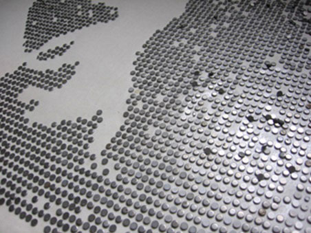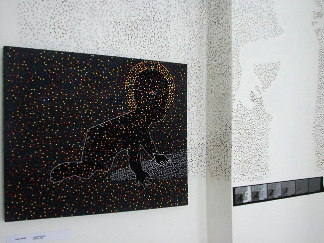 Technika: mix tempera, tuš, kovový odpad. Inštalácia 1,5 x 1,5 m je vystavená v Galérii Elektráreň, Poprad.