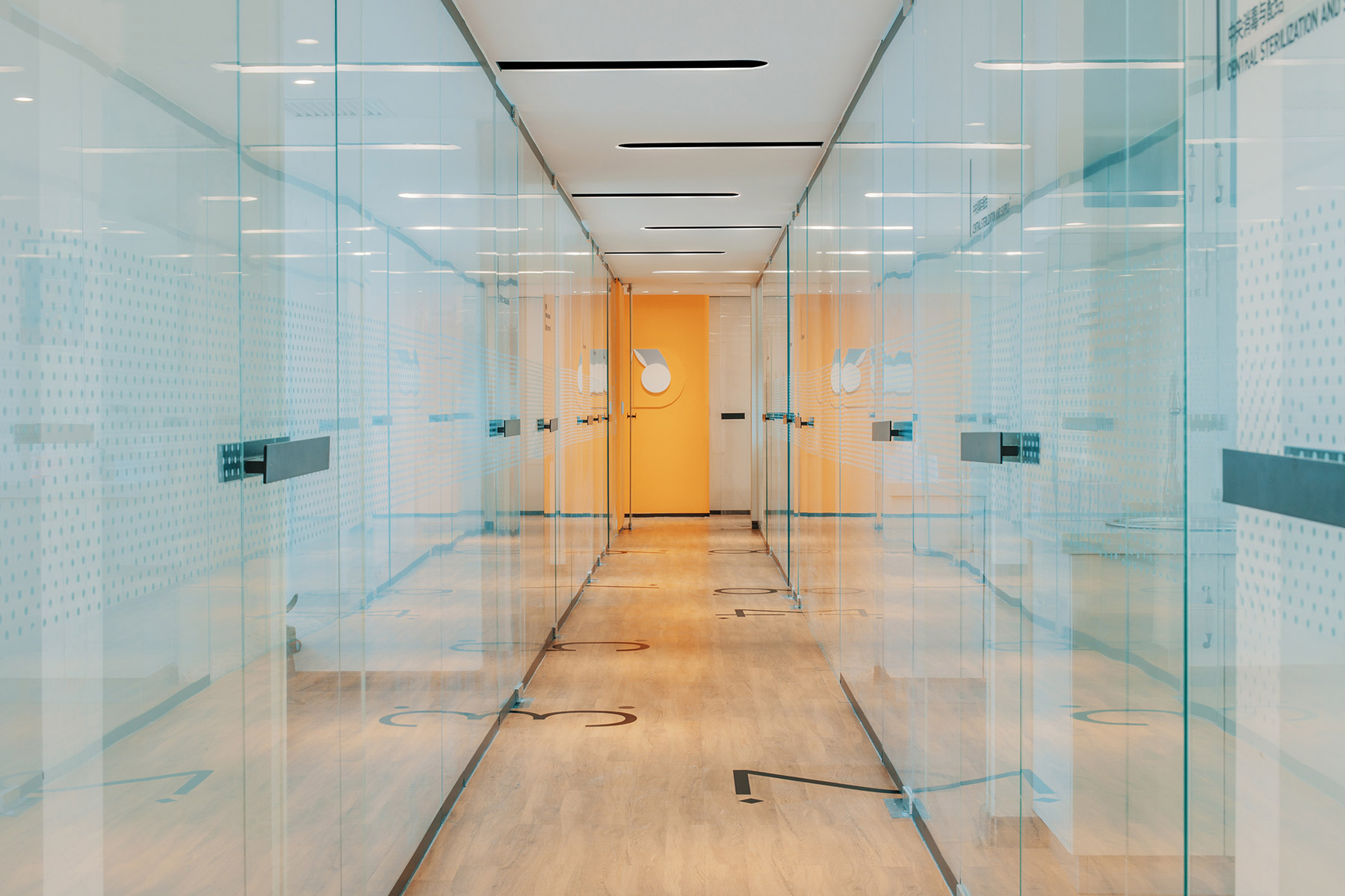 Textúra dreva na rôznych doplnkoch pôsobí upokojujúco, dokonca chýbajú aj stresujúce popisy miestností, všetko funguje vďaka číselnej navigácii na podlahe kliniky.