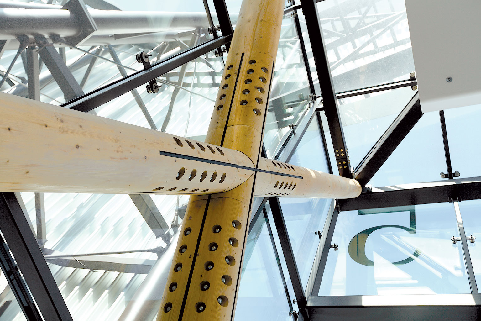Vstupy do nákupného centra boli veľkoryso rozšírené pomocou kovovo- drevenej konštrukcie s celoplošným zasklením.