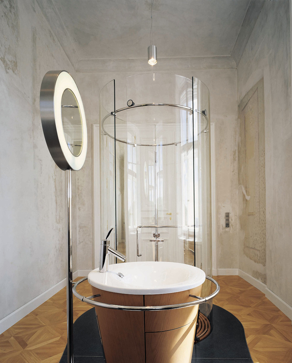 V miestnosti sa teda vytvorilo niečo ako plávajúci ostrov na ploche parkiet. Tento „ostrov“ v sebe zahŕňa toaletu, sprchu v presklenom tubuse a uprostred umývadlo.