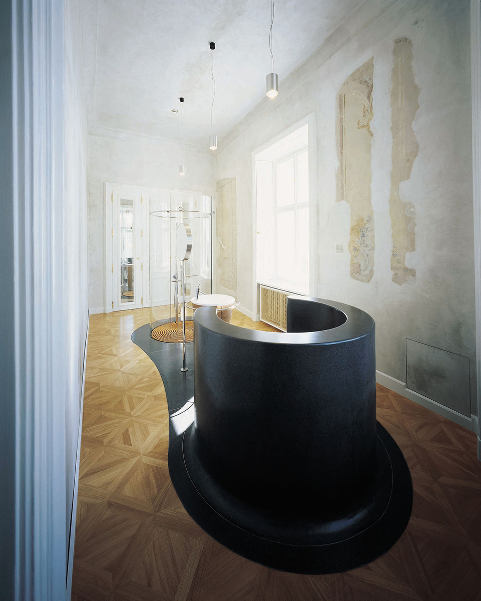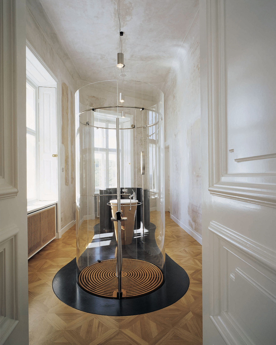 Zariadenie kúpeľne je v dnešnej podobe na jednom dispozičnom ostrove, pričom pôvodný plán počítal s niečím tradičnejším. Je to však akceptovateľné vzhľadom k tomu, že všetko je tým odpojené od stien, umiestnené v priestore.