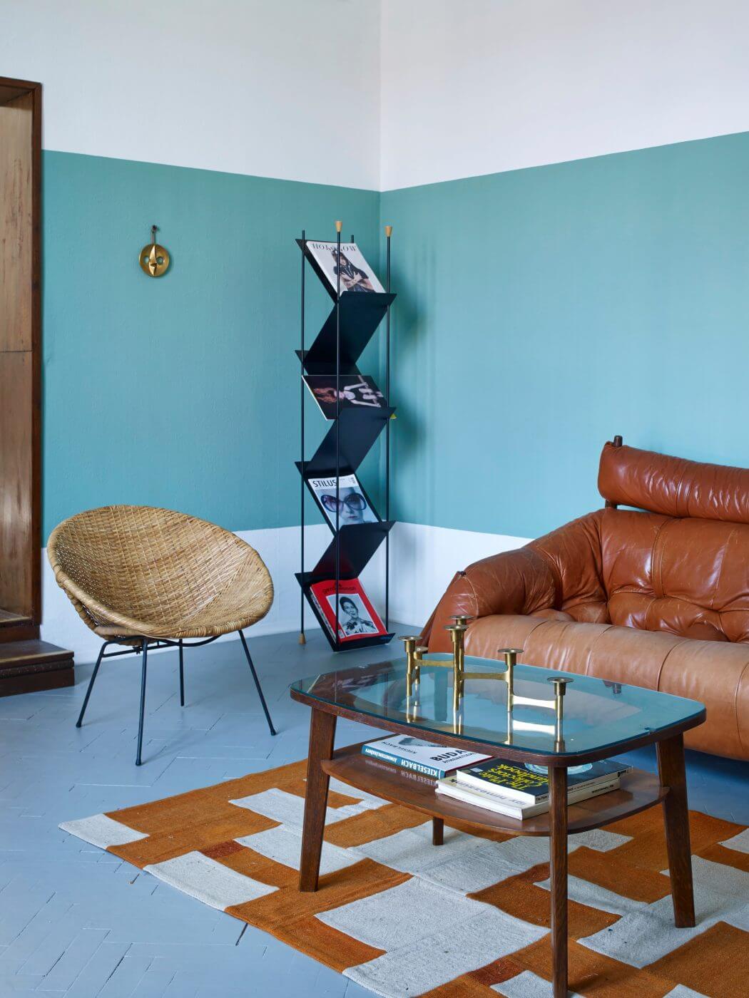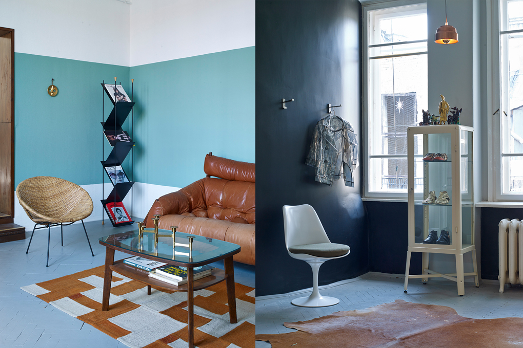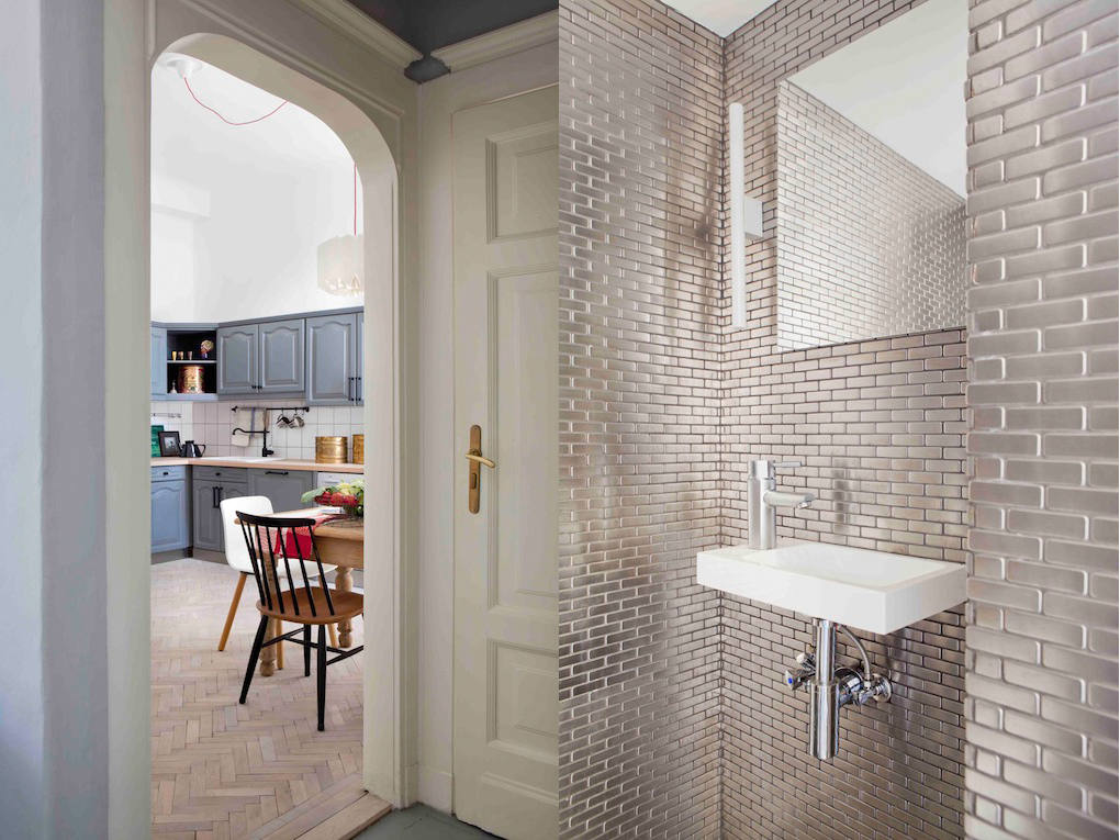 Kombinácia chladných modrých odtieňov a hnedej kože je veľmi pôvabná a vnáša do priestoru dynamiku.  Zachovalé liatinové radiátory v kombinácii s priznanými vodovodnými rúrkami perfektne podčiarkujú dobovú atmosféru budovy z 19. storočia, v ktorej sa apartmán nachádza.