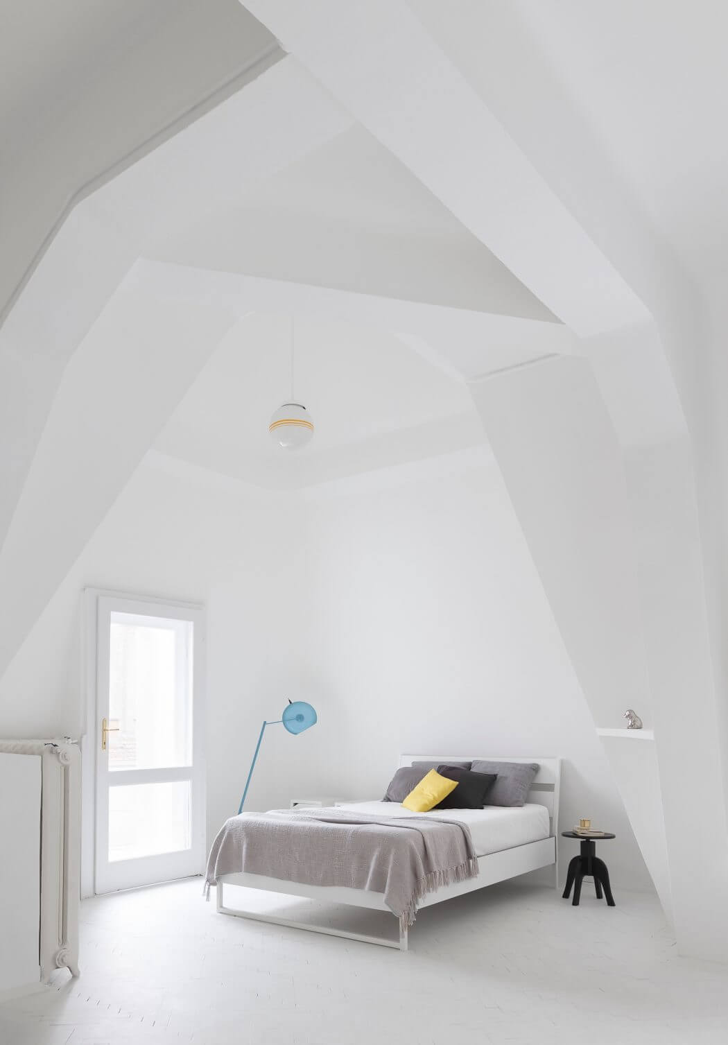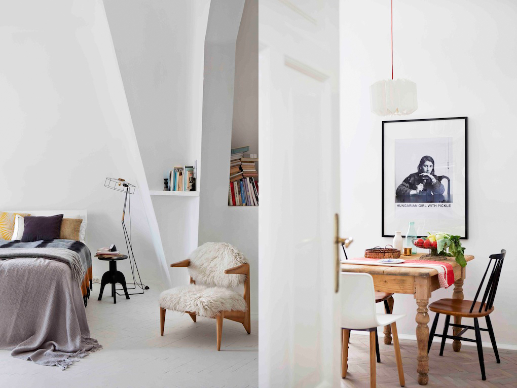 Byt, ktorý bol zrekonštruovaný v roku 2015, je plný svetla, pôsobí sofistikovane, no zároveň komfortne. Dramatické tvary stropov sú prítomné najmä v spálni, ktorej dodávajú skutočne originálny objem. Pôvodné drevené parkety boli ošetrené a namaľované svetlými tlmenými farbami. Na niektorých miestach ich zjemňujú zaujímavé koberce z kožušín.