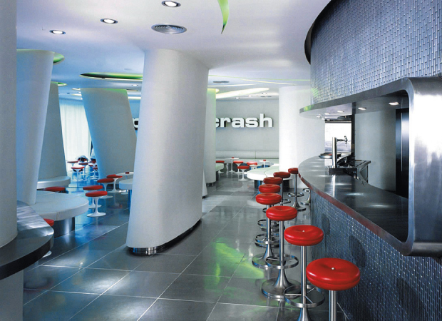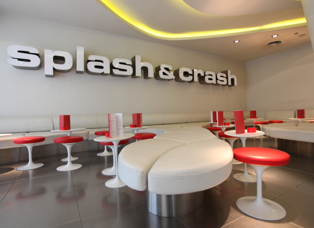 Interiéru baru Splash & Crash je inšpirovaný šesťdesiatymi rokmi minulého storočia. Červená a biela sú farby, ktoré evokujú vášeň a nevinnosť, vlastnosti tak potrebné na vieru v ideály danej doby.