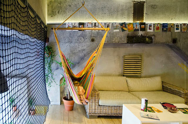 Hojdacia sieť i ľahká drevená konštrukcia majú rovnaký spôsob ukotvenia – z dvoch protichodných strán. Zaneprázdnený život na bratislavskom sídlisku inšpiroval priateľský, otvorený minibar plný energie.