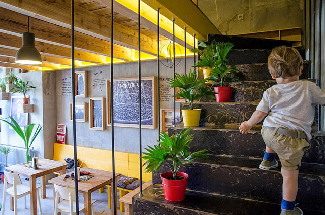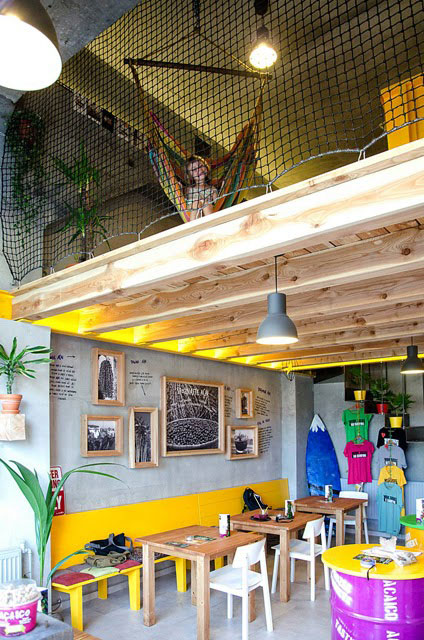 Výrazné farby pripomínajú pútavé sprievody brazílskeho karnevalu. Sedenie sa skladá z rôznych elementov umožňujúcich flexibilné usporiadanie. Pozvánkou je prútená sedačka pred vchodom. Posedenie pri bare bolo nahradené priestorovo úspornejším riešením – plechovým sudom s okrúhlym dreveným pultom.