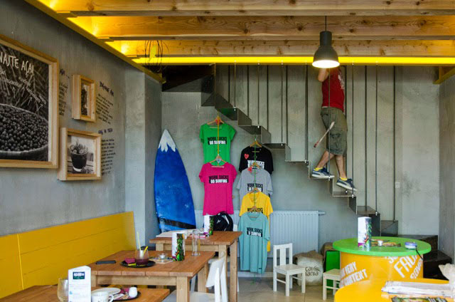 Hlavnými materiálmi v interiéri sú drevo, oceľ a betón, čiže prevažne tie s prirodzeným povrchom. Drevená podlaha, nábytok, barový pult či rámy obrazov kontrastujú s pocitovo chladnejším betónom. Oceľové nosníky so žltým náterom, žltá lavica a doplnky v sýtych žiarivých farbách navodzujú návštevníkovi optimistický dojem. Podsvietenie žltým svetlom dodáva tomuto miestu jedinečnú atmosféru slnka na pláži.