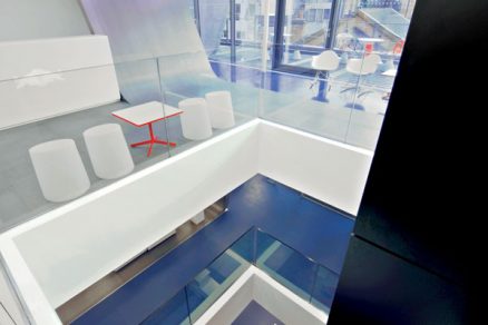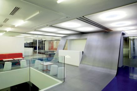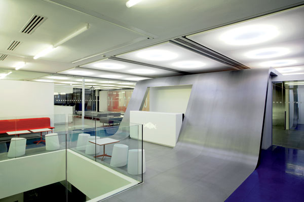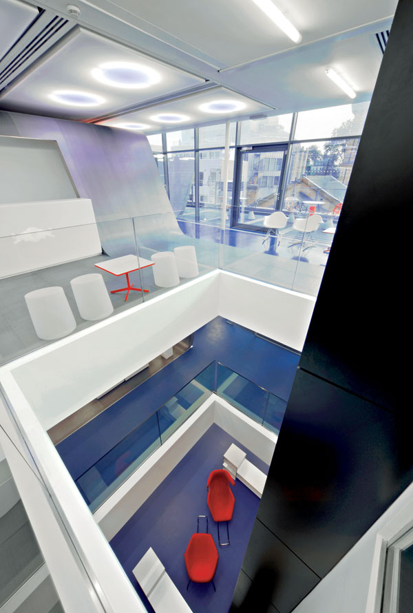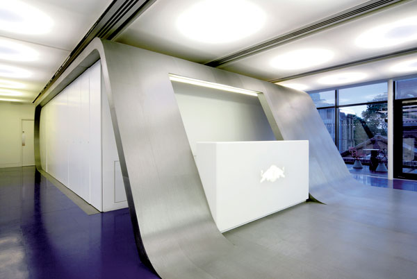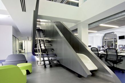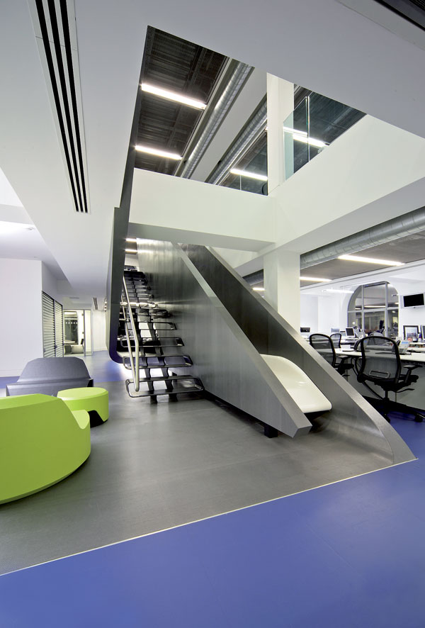Vnútorné schodisko s prvkami s matným i lešteným kovovým povrchom vyúsťuje do jednej z mnohých odpočinkových zón. Patrí k nemu aj plocha na šmýkanie – dokonale v duchu imidžu firmy.  Foto: Gareth Gardner