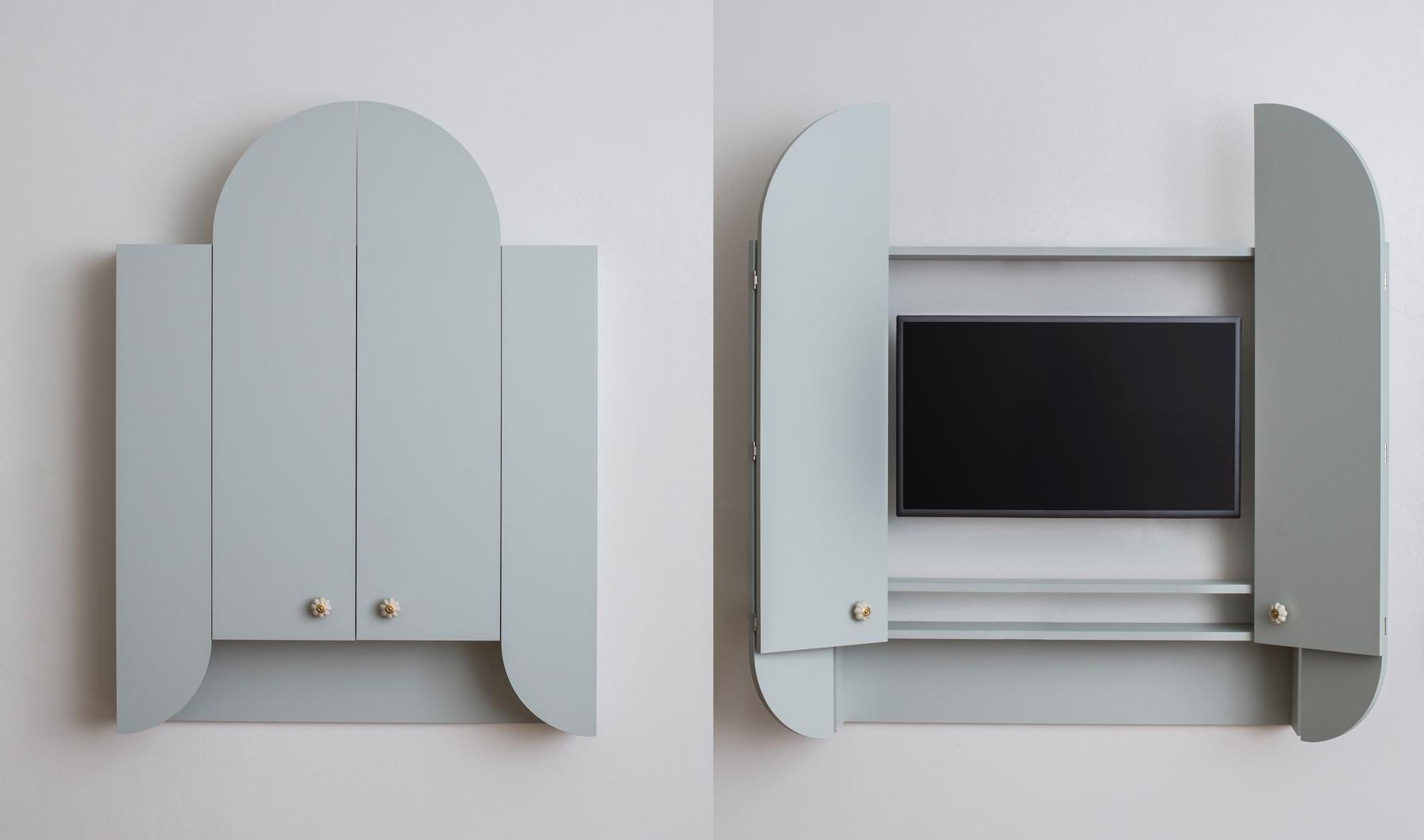 Jedným z týchto detailov je nezvyčajne tvarovaná biela skrinka – oltár, v ktorom je ukrytý televízor.