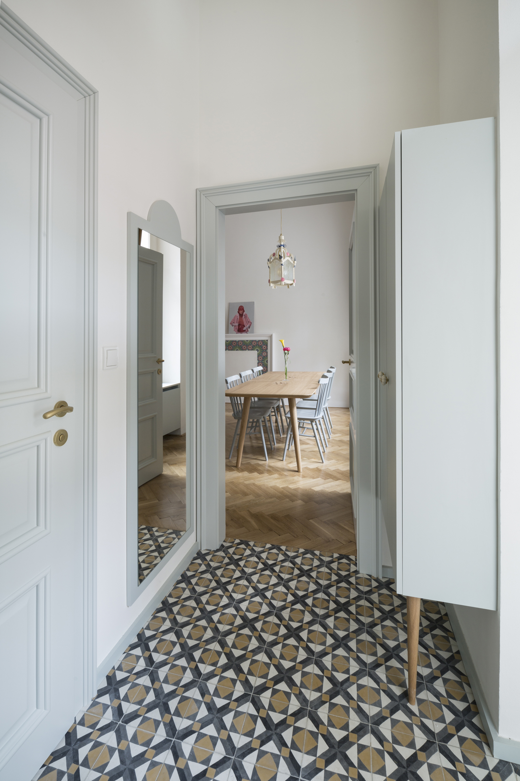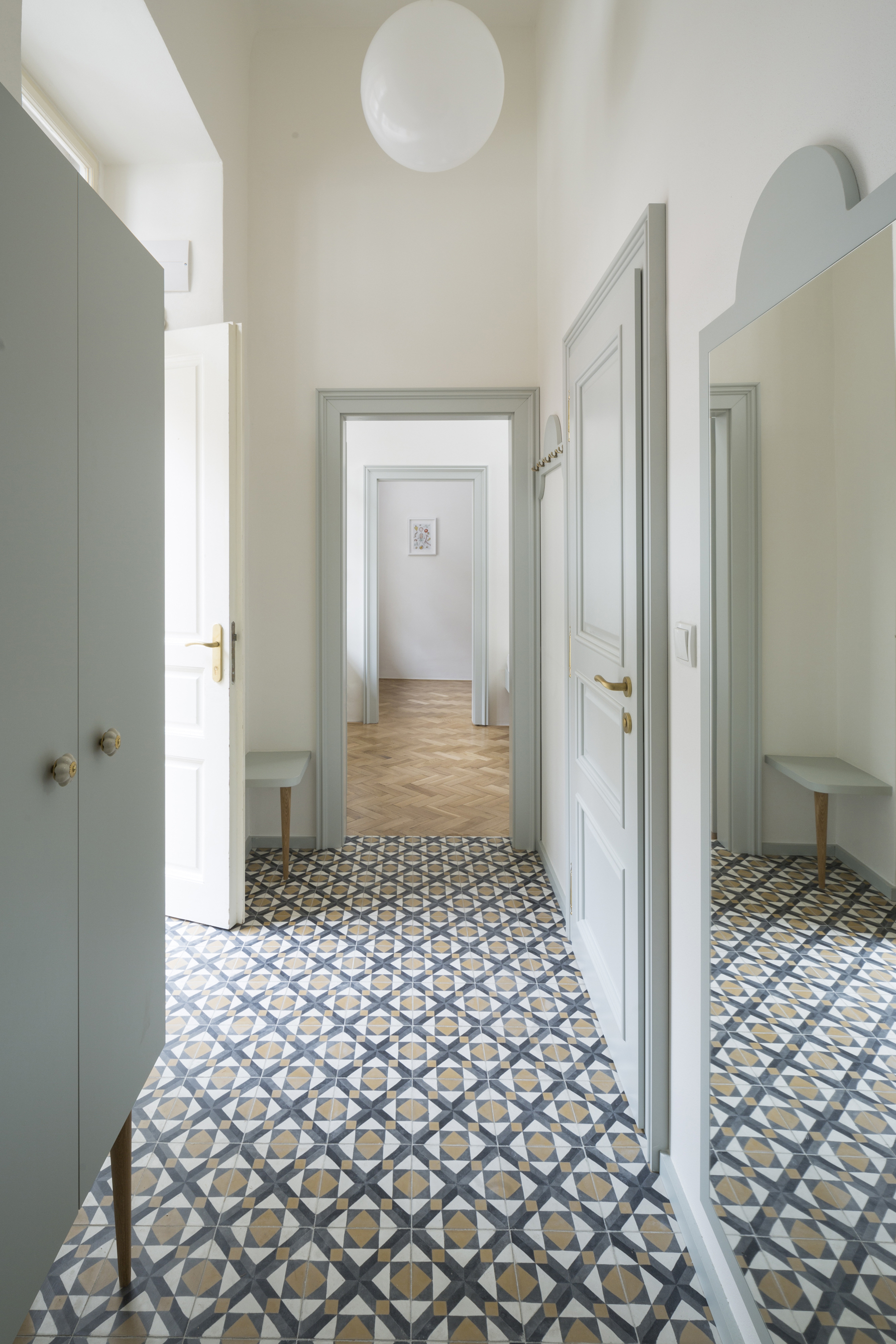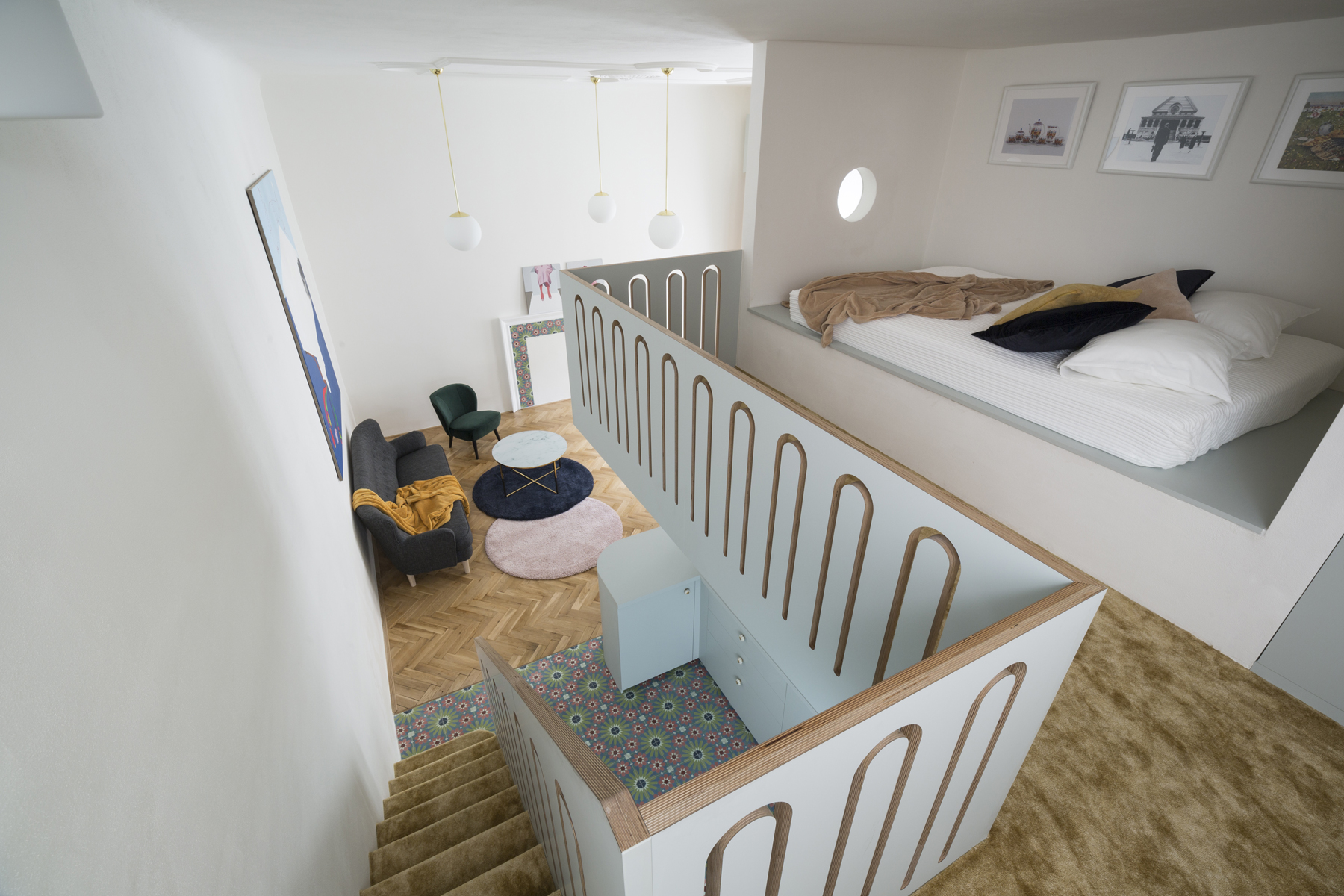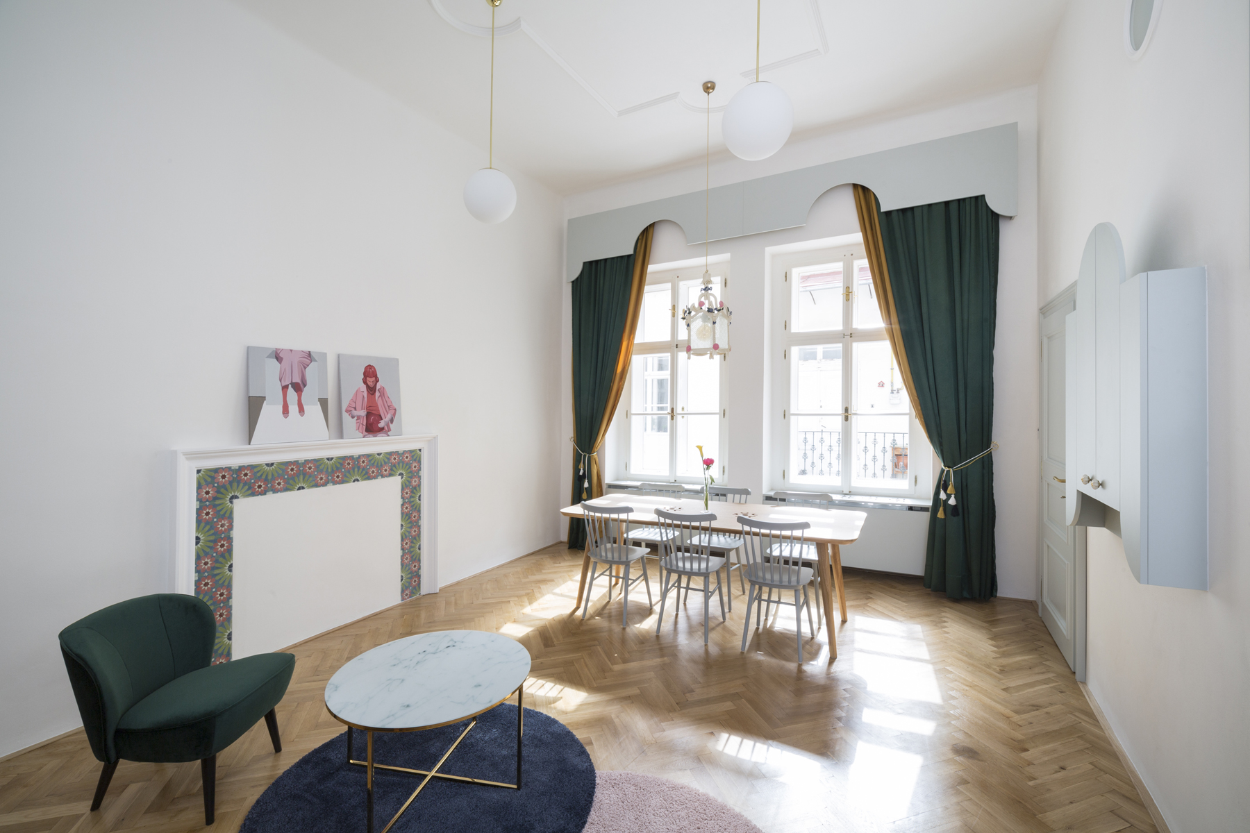 „Voľne sme sa inšpirovali dobovými architektonickými experimentmi s oblúkmi a zjednodušenými formami dekorácií, ktoré sme vniesli do súčasného interiéru. Pokrok z roku 1927 preložený do roku 2017 s miernym nadsadením bol nevyhnutný z dôvodu absorpcie súdobých technológií – od plynového kotla cez oltár na televíziu po skryté prvky online kontrolovaného vnútorného prostredia bytu. Obrazy a reprodukcie dotvárajú most medzi históriou bytu a súčasným svetom,“ vysvetľujú architekti Jakub Filip Novák a Daniela Nováková Baráčková.