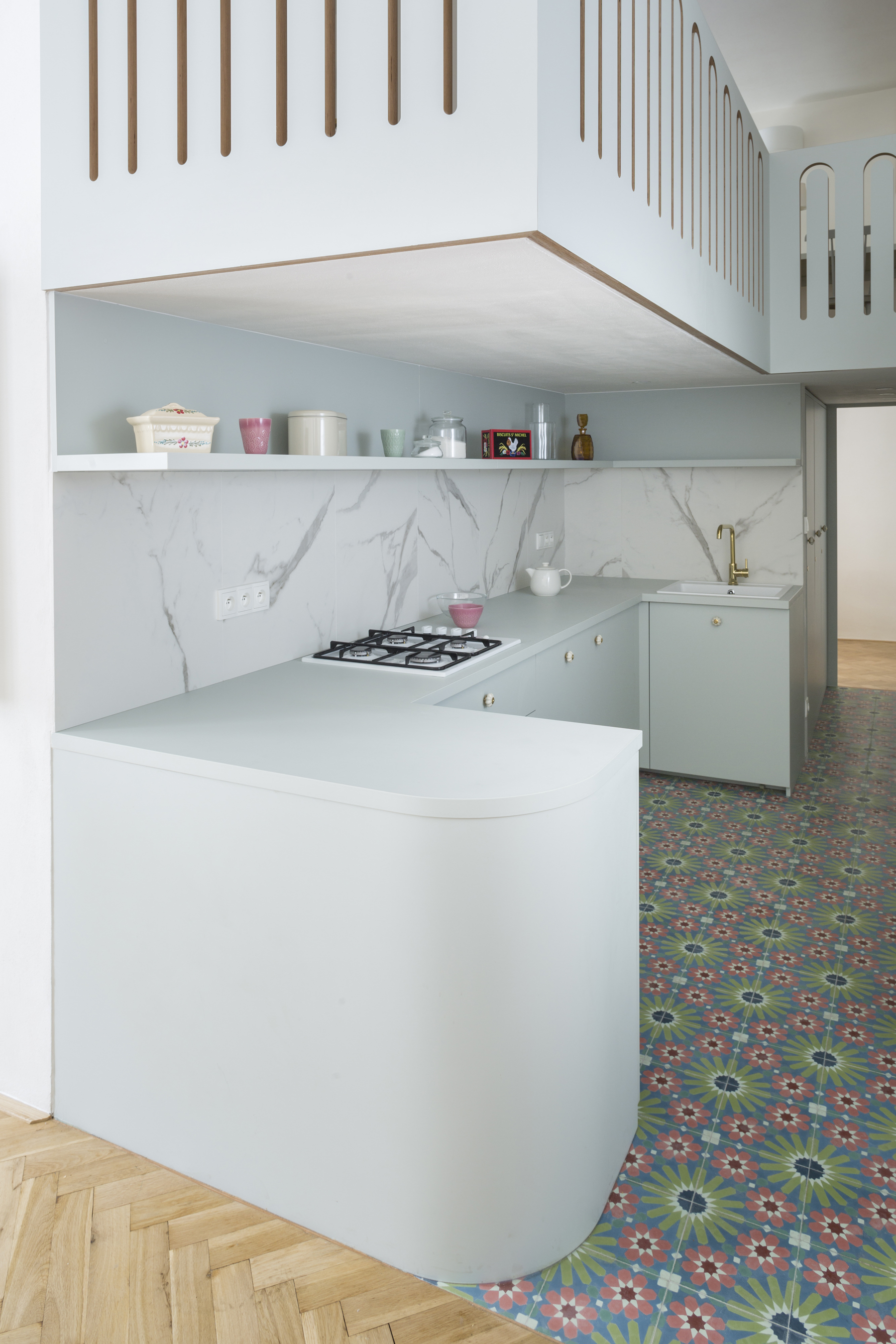 Nás mimoriadne zaujalo riešenie kuchynskej linky, ktorá vyznieva minimalisticky a má príjemne zaoblený jeden kraj. Zaujímavé je však najmä to, že nad kuchynkou sa nachádza príjemný oddychový priestor, do ktorého vedú schody vedľa kuchynskej linky.