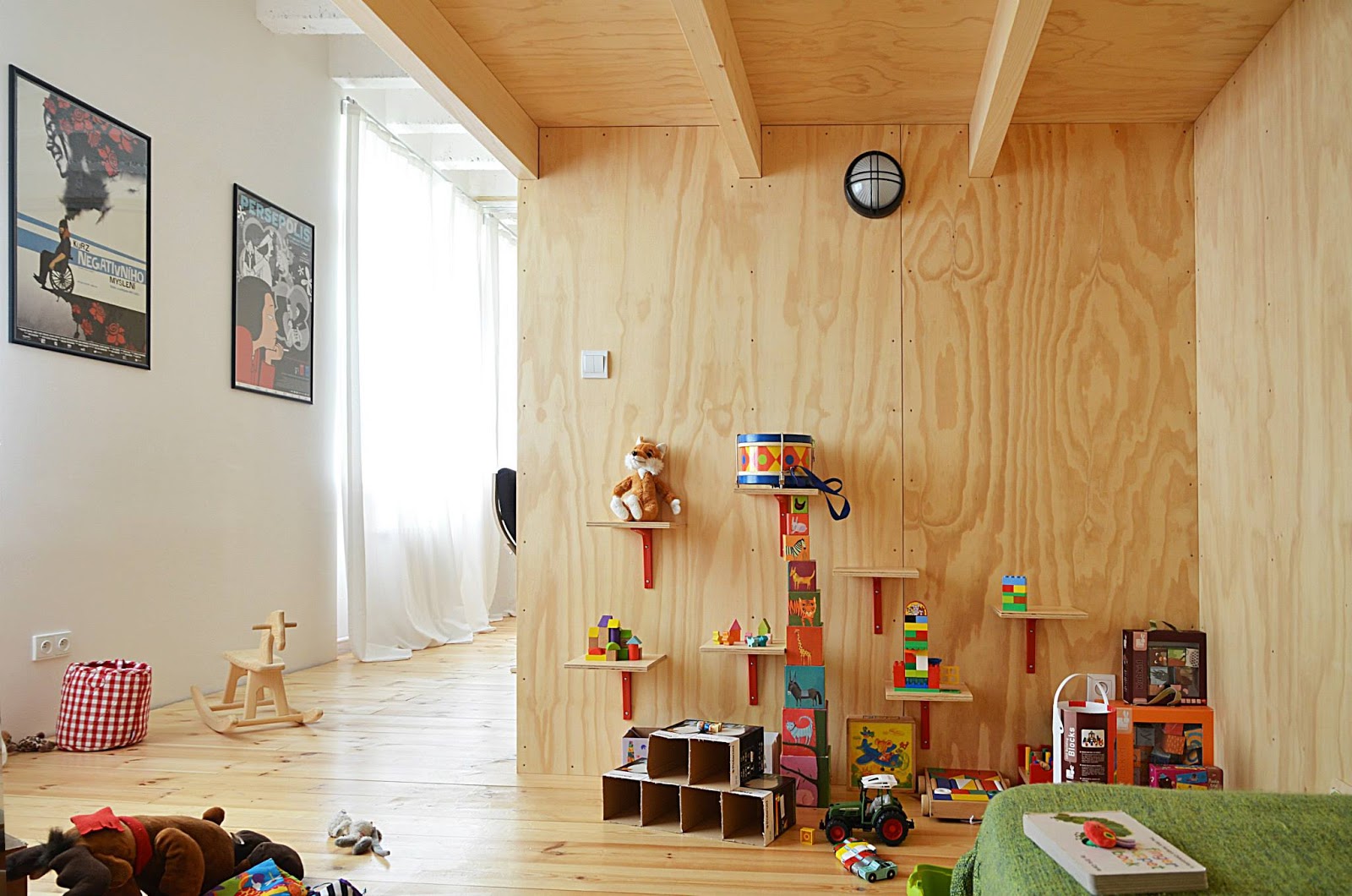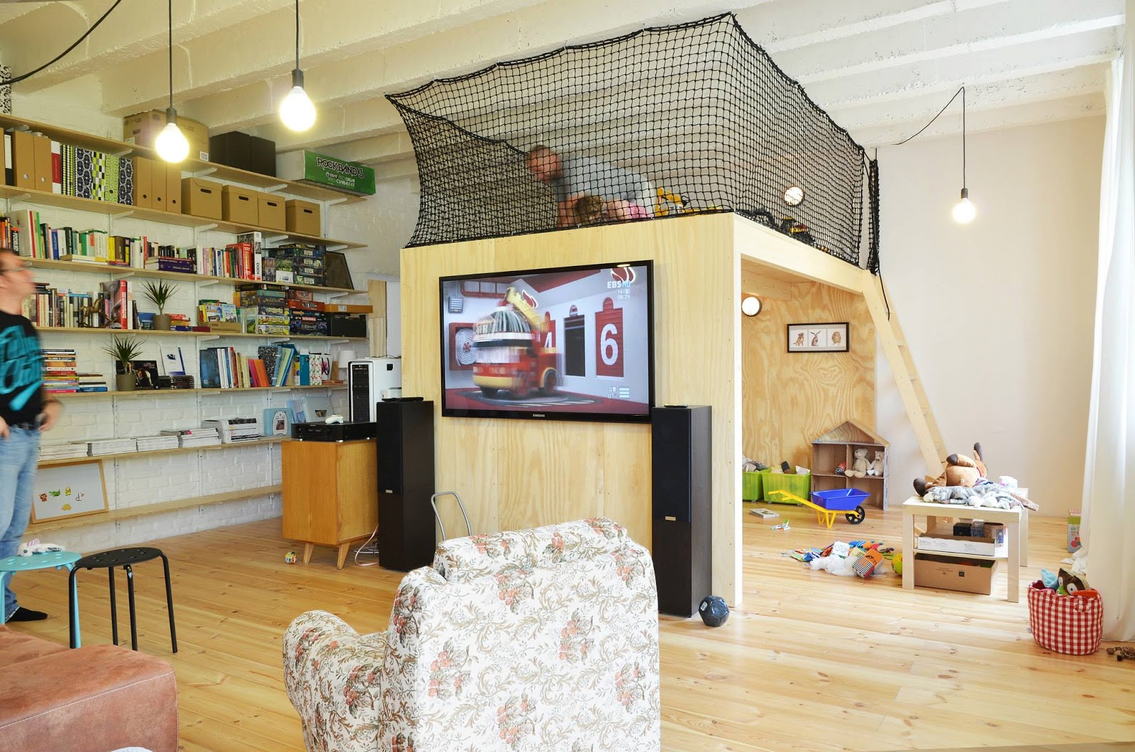 Svojou veľkosťou dominuje bytu spoločenská časť. Na niekoľkých štvorcových metroch nájdeme obývaciu izbu, pracovňu, detskú izbu i „rozhľadňu“, ktorá slúži na oddych i hranie, s výhľadom na celú miestnosť. Spálňa rodičov bola minimalizovaná a oddelená posuvnou priečkou. Tu sa nachádza aj priestranný šatník.