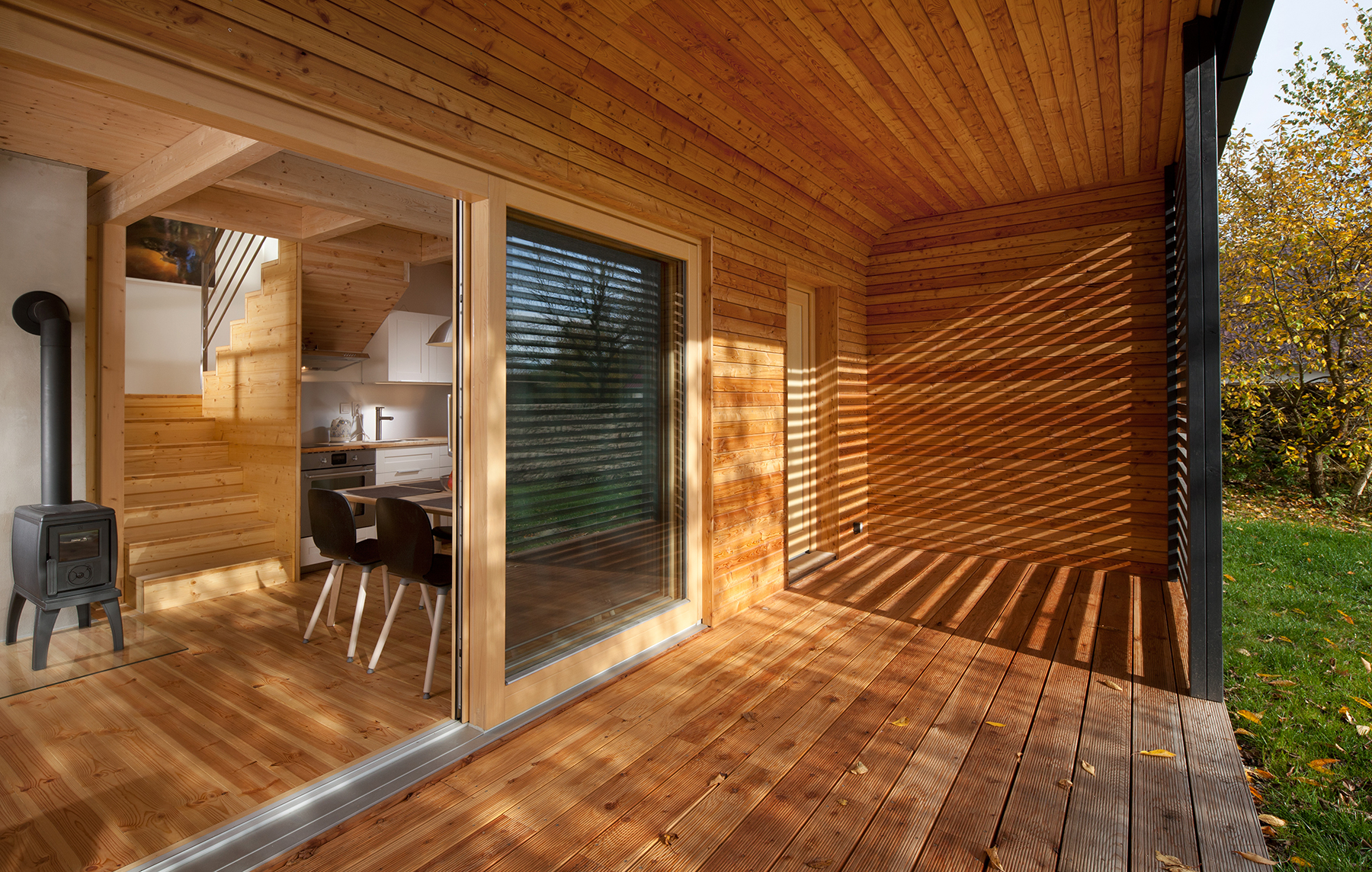Jednoduchý obdĺžnikový objem domu je doplnený praktickou vonkajšou terasou, ukrývajúcou sa pod presahom strechy. Poskytuje výhľad na záhradu a centrum obce. Pravá časť terasy je chránená pred priamym slnkom tieniacou zástenou.