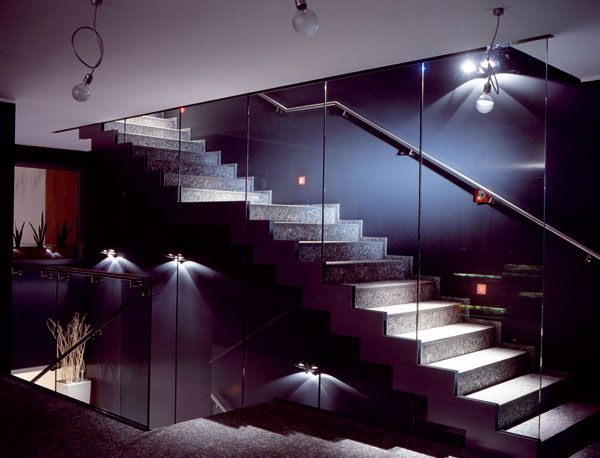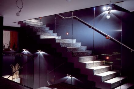 Prírodné materiály sú uplatnené tiež v interiéroch  Hra svetiel na schodisku