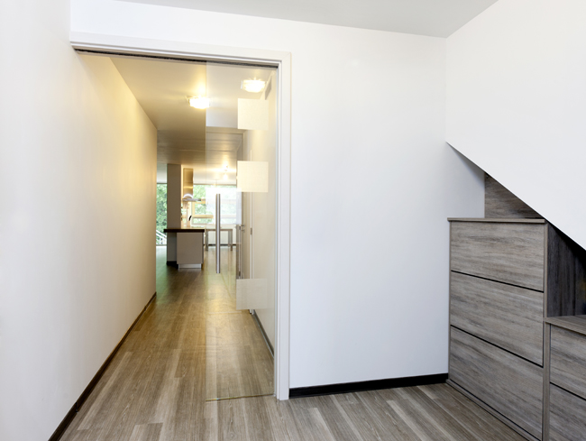 Celosklenené posuvné dvere oddeľujú centrálnu časť domu od vstupnej chodby. „Aj tu sa využilo Grafosklo. Majitelia si zvolili číry variant. Dostatočne tak oddelili jednotlivé miestnosti, ale opticky ich prepojili a umožnili dostatočné šírenie svetla celým interiérom. Jemná grafika zo štvorcov uľahčuje orientáciu a upozorňuje, že priestor je oddelený sklom,“ uzatvára pán Paksi.