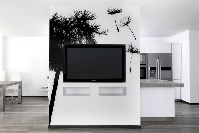 „Investor požadoval moderné a minimalistické vybavenie s ohľadom na zachovanie veľkorysosti priestoru. Jeho želanie sa podarilo realizovať jedinečným spôsobom. Dominantným prvkom interiéru je GRAFOSKLO so vzorom odkvitnutej púpavy v čiernobielej úprave. Hlavný obytný priestor kuchyne a obývačky rozdeľuje stena s obkladom z GRAFOSKLA so zabudovaným televízorom. Z kuchynskej strany je na nej digestor s varným centrom. Táto koncepcia stojí na decentnom dekore vinylovej podlahy, ktorá sa z chodby tiahne až do hlavnej časti interiéru. Rovnaký materiál – tentokrát Grafosklo s geometrickým vzorom – sa použil i v kúpeľni. Biela farba výrazne lesklého nábytku odráža svetlo a ešte viac rozjasňuje interiér. Sklenené posuvné dvere oddeľujú jednotlivé miestnosti, a zároveň umožňujú ich optické prepojenie.