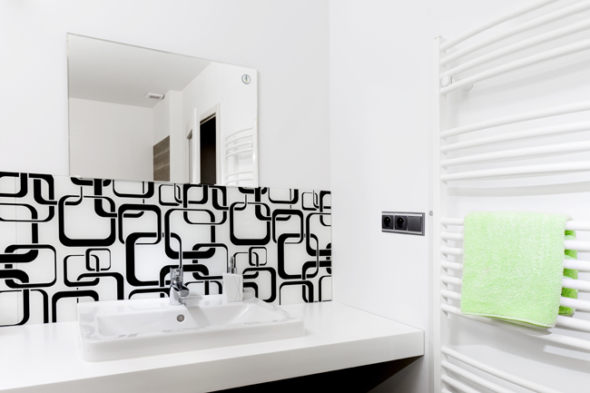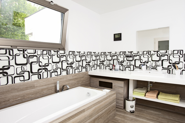 Grafosklo ako obklad v kúpeľni, foto: J.A.P. Slovakia Grafosklo v kúpeľni – detail grafiky, foto: J.A.P. Slovakia