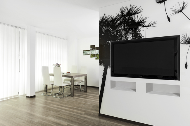Televízna stena s motívom púpavového páperia oddeľuje obývačku od kuchyne, foto: J.A.P. Slovakia Televízna stena a jedálenský kút, foto: J.A.P. Slovakia