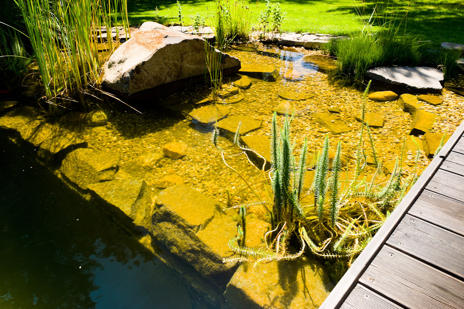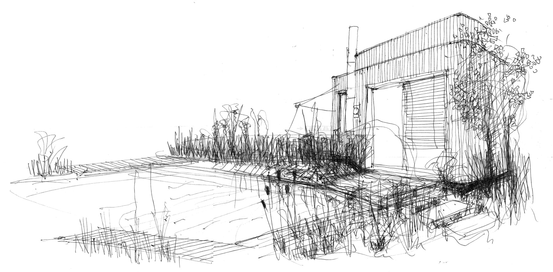 Na najnižšej úrovni domu a jeho prízemia sa nachádza hlavný obytný priestor, ktorý je cez veľké zasklené plochy a mólo prepojený s kúpacím jazierkom. V otvorenom južnom rohu budovy sa nachádza veľká terasa určená na stolovanie priamo v exteriéri. Je obklopená okrasnými trávami a bylinkovým záhonom, pred priamym slnkom ju chráni veľká biela textilná membrána.