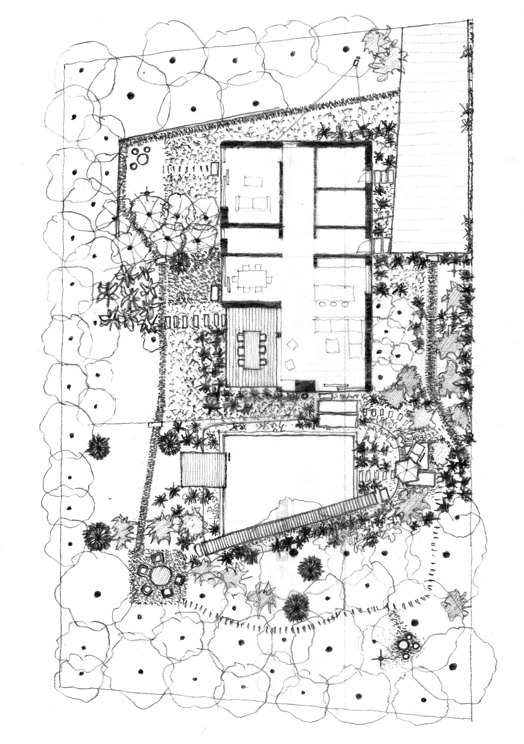 Obdĺžniková parcela s povrchom mierne sa zvažujúcim smerom na juhozápad podnietila autorov projektu umiestniť dom na svoju hornú časť – čo najbližšie k ulici. Klesajúca časť pozemku sa tak skrýva v súkromí a poskytuje domácim možnosť čo najpríjemnejšieho bývania i využitia záhradky.