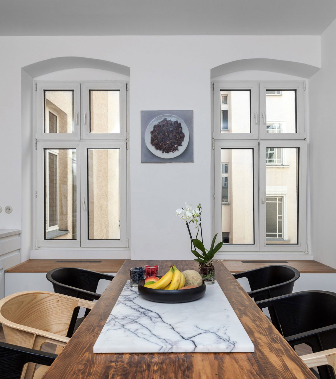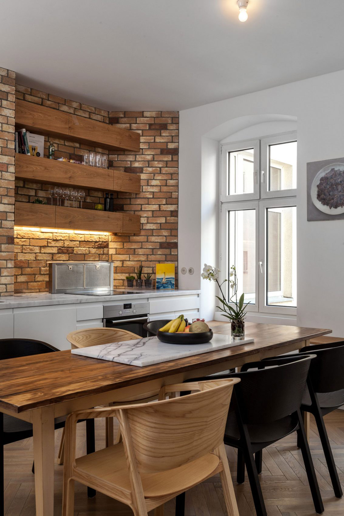 Napokon, pre staré byty v tejto oblasti sú typické štedré podlahové možnosti a na ploche 85 m² sa dalo výborne pracovať so zmenou dispozície. Architekti na čele s Anou Lytvyniuk sa rozhodli odstrániť niektoré priečky a týmto spôsobom premeniť priestor, v ktorom sa dalo pohybovať lineárne, na priestor s oválnou priechodnosťou naprieč celým bytom. Dokonca sa im podarilo byt prestavať tak, aby jednotlivé miestnosti boli dostupné aj v prípade, ak sú v byte ubytovaní hostia a hostiteľ nechce narušiť ich súkromie.