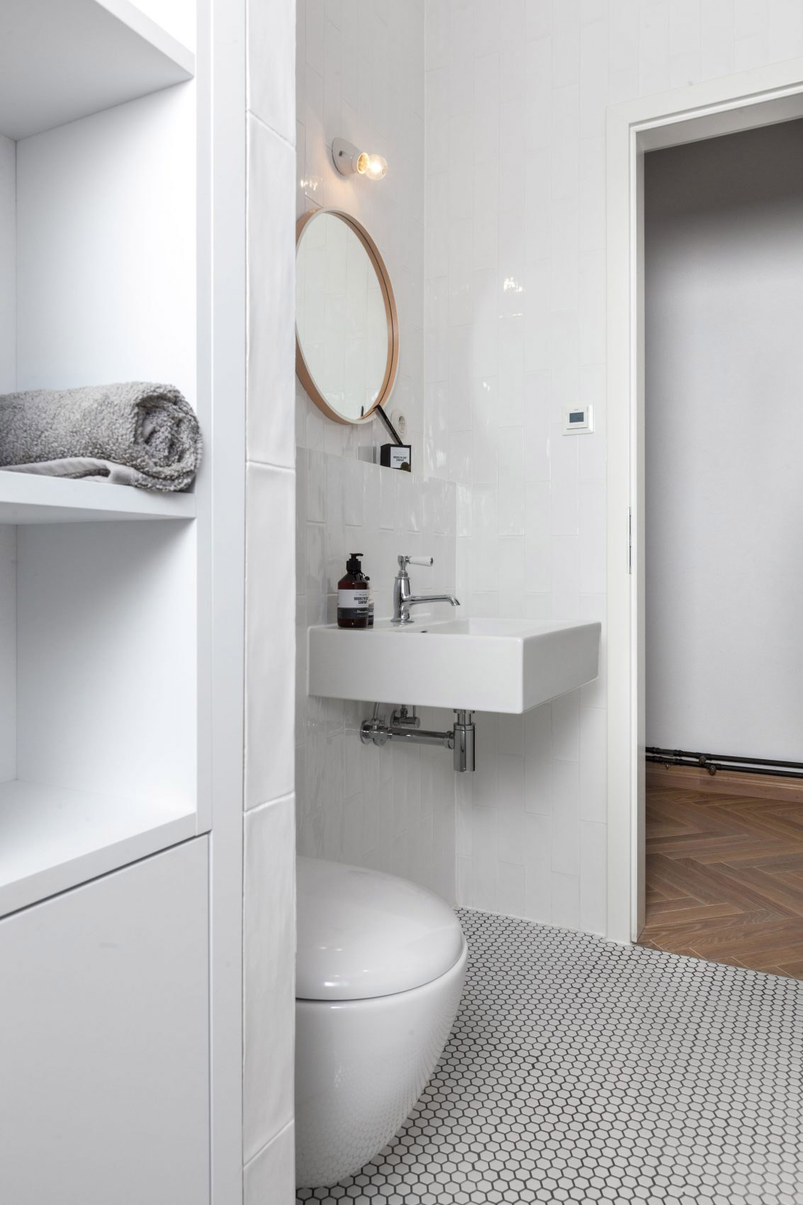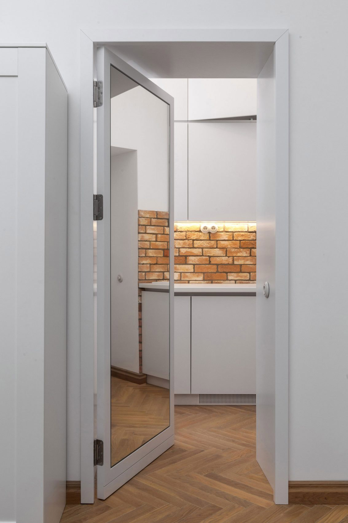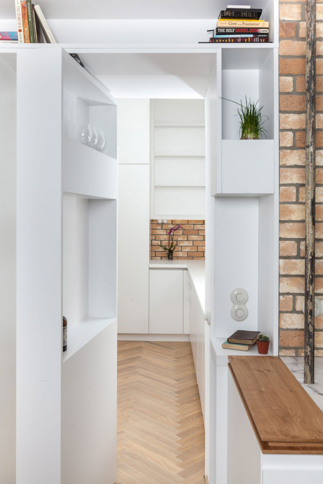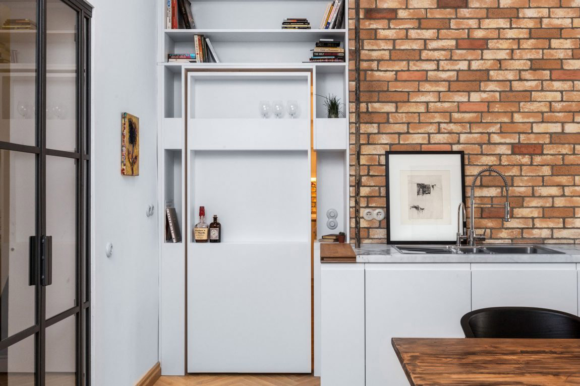 Zo spálne sa dá zrkadlovými dverami poľahky dostať do špeciálnej miestnosti, ktorá sa ukrýva za kuchyňou a má viaceré využitia – od skladu cez špajzu až po „predĺženú ruku“ kuchyne. Do tejto miestnosti sa dostanete pravdaže aj z kuchyne, a to prostredníctvom elegantne zamaskovaného vstupu, ktorý na prvý pohľad vyzerá (a zároveň aj slúži) ako súčasť kuchynských poličiek. Týmto priechodom sa nám kruh pohybu v byte uzatvára.