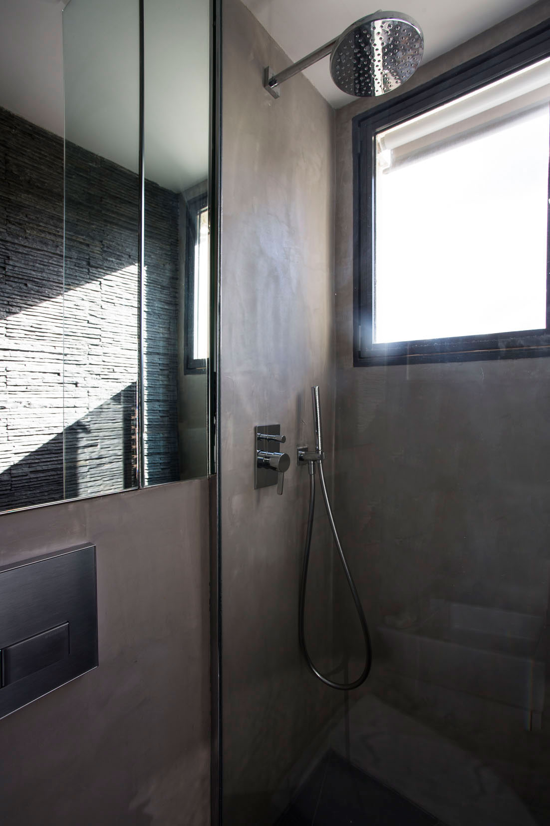 Skryté úložné priestory v kuchyni a na obývačkových stenách sú ďalším esom v rukáve majiteľa, pretože umožňujú bleskovo a efektne skryť všetko, čo má pred návštevou zostať ukryté. Kúpeľňa napriek svojej rozlohe poskytuje plný komfort, je riešená skutočne minimalisticky. Ku oknu oproti posteli/sedačke sa podarilo umiestniť ešte praktický pracovný kútik so stolom tvoreným lištou umiestnenou na jednej stene a tiahnucou sa až do rohu miestnosti.